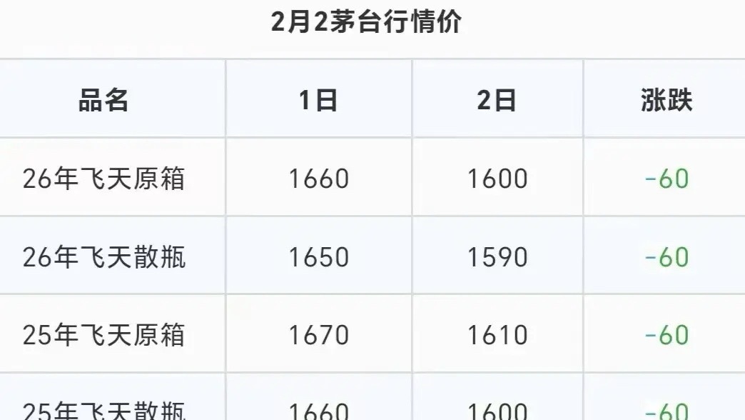 2月2日贵州茅台的飞天茅台继续大跌,白酒板块注意追高风险:2月2日飞天茅台价格还在跌,白酒板块只是诱多反弹,没有人比我更懂白酒板块和白酒基金!我周末就说了,白酒板块注意追高风险!因为飞天茅台价格2月还在跌,昨天每瓶跌40元,今天跌60元,两天跌了100元,今天原箱飞天茅台只有1600元每瓶了,散装跌到了1590元每瓶,那些去抢茅台的人抢了个寂寞,再跌两天就不用抢了。说了年轻人不喝白酒,这么贵的白酒没人买了自己喝,送礼的人也少了,也没人敢收了,社会风清气正,商务应酬消费茅台也少了,我说2021年白酒板块滴酒不沾是对的,2026年还是滴酒不沾,投资者注意追高风险!