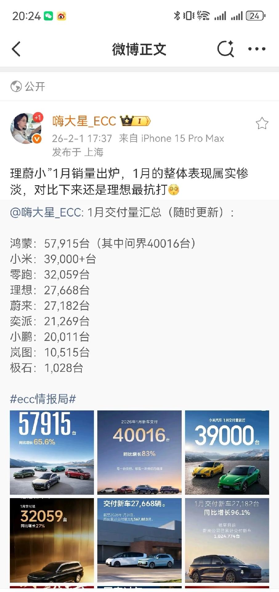 26年1月问界交付40016台,新势力第一 1月交付量汇总(随时更新): 鸿蒙:57,915台(其中问界40016台) 小米:39,000+台 零跑:32,059台 理想:27,668台 蔚来:27,182台 奕派:21,269台 小鹏:20,011台 岚图:10,515台 极石:1,028台 赛力斯股价的利好已经出尽了啊,剩下的就是纯工厂生产模式,要理解炒股一定是预期值。