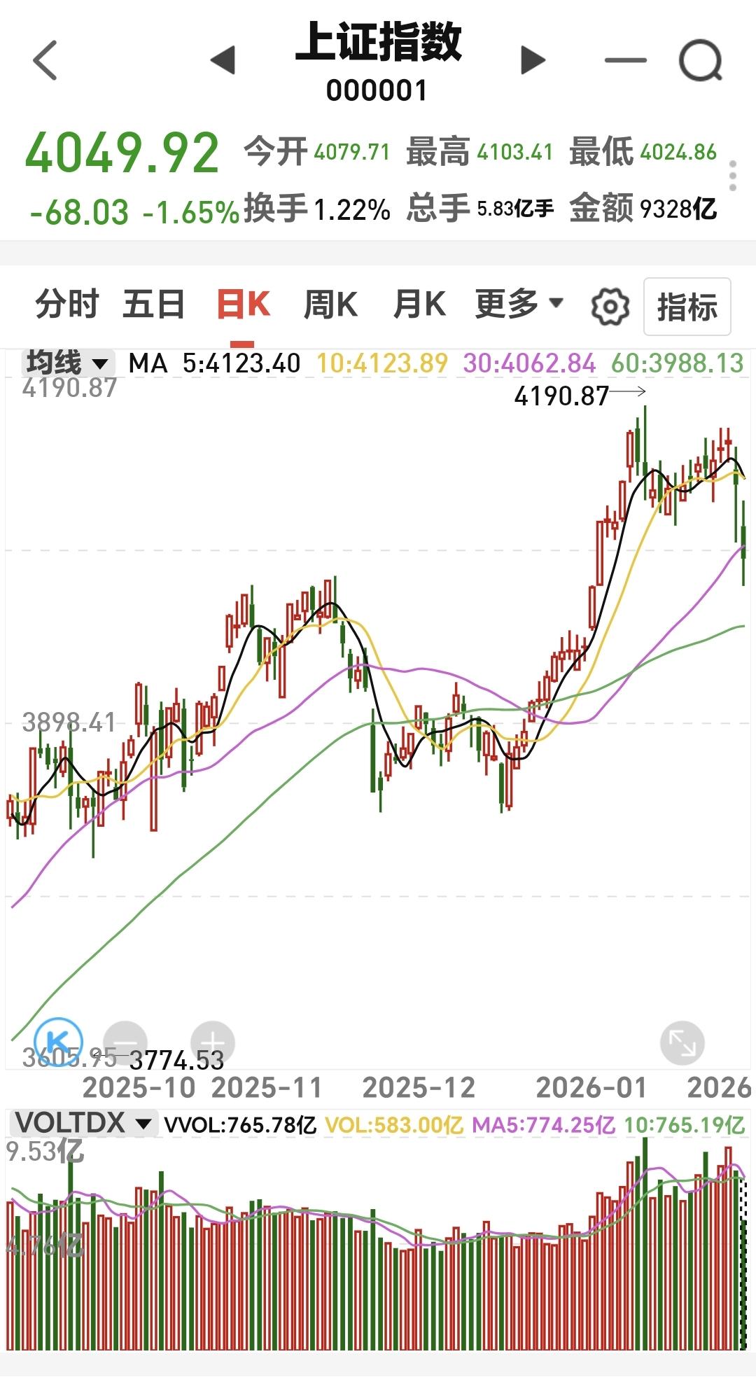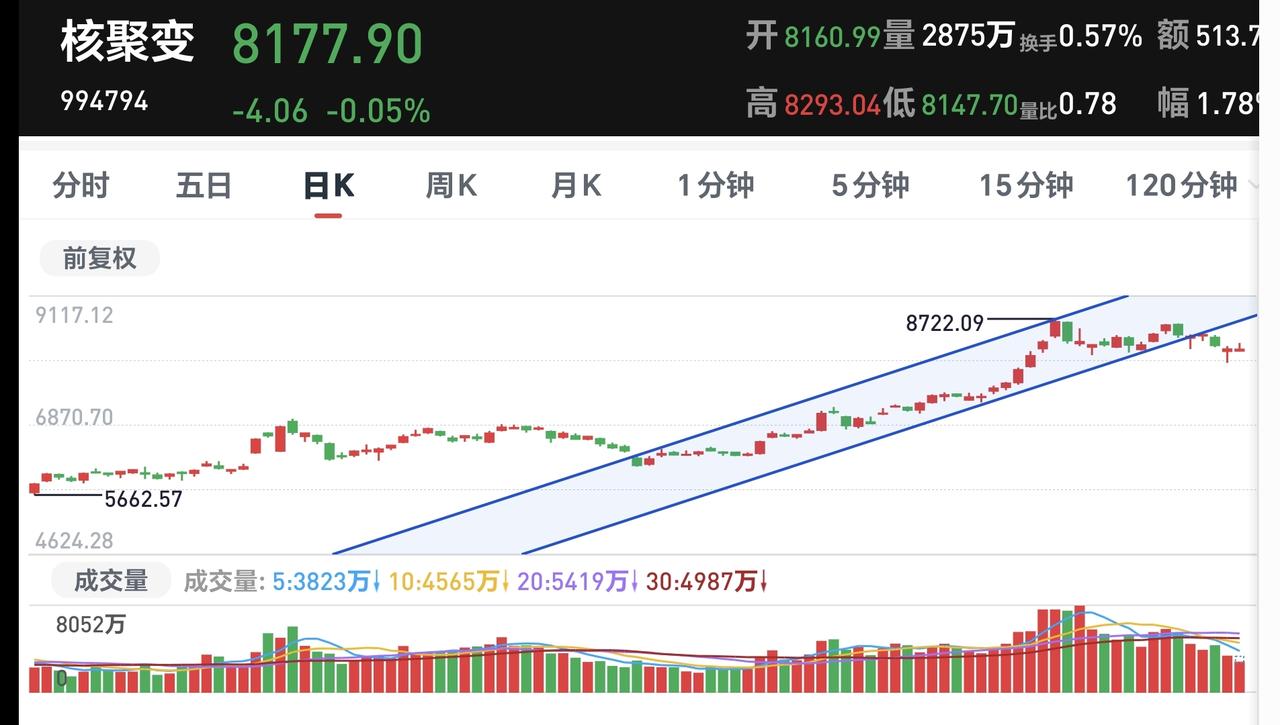 基金:有色金属黄金白银,可不可以抄底 市场下午是探底回升,现在的下跌幅度都已经缩小,创业板指下跌了0.93%,盘中点位3315点,上证指数下跌了1.67%,盘中点位4049点。 黄色线还是在蓝色线上方,这是能够探底回升的主要原因,两市累计成交20787亿,相比于上周五缩量的14%,说明在刚才的回升过程当中是有资金进场的,上涨1800多家,下跌3500多家,涨停44家,跌停97家,主力资金净流出697亿。 主力资金净流入最多的三个板块是:电网设备板块,主要消费板块,白酒板块,净流出最多的三个板块是:国企板块,蓝筹策略板块,高端制造板块。 持有的基金中,估值上涨幅度最大的三个板块是:白酒板块,可控核聚变板块,大消费板块,下跌幅度最大的三个板块是:芯片半导体板块,兴全合宜,先进制造板块,估值整体亏损了1.51万。 看下面的截图8,这是固态电池板块日K线图,上周下跌跌破了上涨通道的下轨线,今天是继续下跌,这说明固态电池板块日线级别上涨趋势已经被改变。 看下面的截图9,这是固态电池板块周K线图,现在的位置处于这个上涨通道内,近期观察能不能在上涨通道下轨线附近止跌,如果不跌破这个上涨通道的下轨线,这里就是一个进场点,如果跌破这个上涨通道的下轨线,长线持有的人也是要注意风险。 看下面的截图10,这是软件板块周K线图,软件板块也就是AI应用板块,现在的位置处于这个上涨通道内,与上下轨的距离差不多远,长线持有的人可以继续持有,除非跌破这个上涨通道的下轨线,再考虑要不要止盈出来观望。 看下面的截图11,这是稀土永磁板块日K线图,上周五下跌跌破了上涨通道的下轨线,今天是继续下跌,跌破上涨通道下轨线就有可能改变了日线级别的上涨趋势。 看下面的截图12,这是稀土永磁板块周K线图,现在的位置处于这个上涨通道中,与上涨通道的下轨线还有一段距离,长线持有的人可以继续持有,在跌破上涨通道下轨线的时候,才可以考虑要不要止盈出来观望。 看下面的截图13,这是可控核聚变板块日K线图,上周下跌跌破了这个上涨通道的下轨线,本周是在上涨通道下方震荡,在跌破上涨通道下轨线的时候,日线级别的上涨趋势就可能已经被改变。 看下面的截图14,这是可控核聚变板块周K线图,现在的位置处于这个上涨通道中,最近的下跌并没有跌破这个上涨通道的下轨线,这个板块的周线级别上涨趋势还在,长线持有的人可以继续持有。 还有没有人记得我说的话,最需要注意的是,前段时间没有吃到肉,不可以在挨打的时候有你,如果前段时间没有吃到肉,现在挨打的时候有你,那你就是太冤枉了。 收盘的时候观察能不能站上4060点,如果说在这个点位之下,后面破4000点的可能性大增,明天盘中可能会有反弹,反弹的过程中最重要的是成交量,也就是看反弹过程中有没有资金进场,今天收盘之前的反弹也可以观察一下有没有资金进场,没有资金进场的反弹都是无效反弹。 今天究竟应该怎么办?我会在评论区留言。 许多人在问有色金属,黄金和白银,现在可不可以进场抄底?我可以告诉你的是,我肯定不会是去抄这些板块的底,这些钱不是我认知范围内的钱,宁可错过不可做错。 花一秒钟点赞,花30秒钟评论,就是对我最大的支持,谢谢大家的支持。