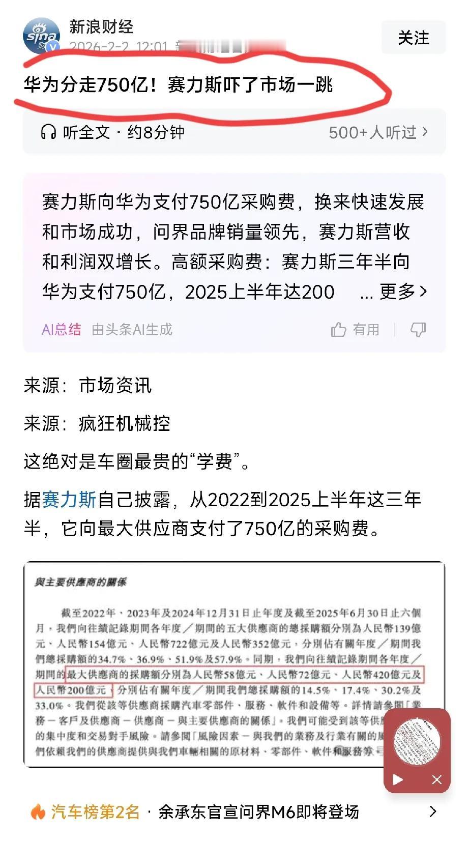 华为分走750亿?不是分走750亿利润,而是赛力斯向华为支付750亿的产品采购款总额吧!