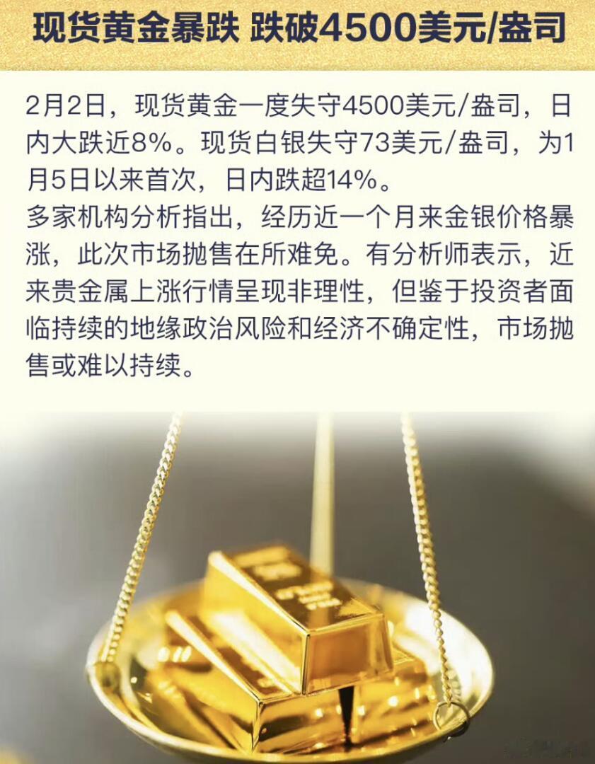 这次金价的暴跌,到底是咋回事?我听了一个说法,是美联储那边可能要上来一个“很角色”,资本担心未来的降息要黄了,所以很多炒金的资金就疯狂出逃。另外还有说法,就是中东那边的局势缓和了,金价也就下来了。不管怎么说,这波金价的大起大落真是过山车同款体验,有人动手迅速赚了不少,有人高位上车赔了稀里哗啦,还是那句话:投资需谨慎,投机代价高!黄金史诗级暴跌还在持续金价金价下跌30克金镯2天降价6000元 黄金