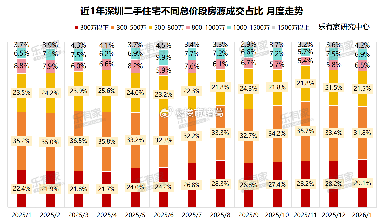 据乐有家披露,1月深圳总价800万~1000万、1500万以上二手住宅成交占比略微提升,累计增幅1.3%;300万以下二手住宅成交占比也提升了近1个百分点。反馈到房价上,1月二手房成交均价为5.78万/㎡,已连续2个月出现小幅回升。