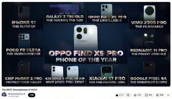 值得一提的是,OPPO Find X9 Pro还在科技评测人Mrwhosetheboss的年度评选中斩获“年度最佳手机”与“最佳续航手机”两项大奖,成为今年唯一一款在多个关键项目中超越苹果iPhone 17系列及三星S25 UItra的安卓设备。