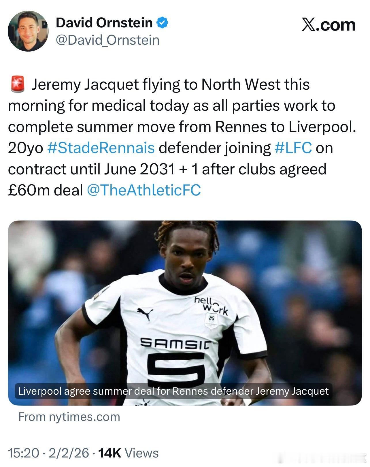 通稿,雅凯今天早上飞往利物浦接受我军体检,转会费6000万欧元➕1200万欧元的附加条款。合同年限5+1。