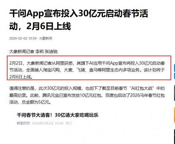 乱了,彻底乱了,今年的春节有好戏看了! 阿里千问30亿、腾讯元宝10亿、百度5亿,再加上一个拿下春晚赞助的豆包,大厂都将“手”伸向了今年的春节。 我敢说,今年的春节绝对是有史以来AI气氛最浓烈的一届,大厂纷纷参与春节AI大战,可谓是看头十足。 尤其是千问,魄力是真的足啊,官宣投入30亿启动“春节请客计划”,说是要在春节期间请全国人民吃喝玩乐,给我们免单。 别的不说,单说这金额在这次大厂春节AI大战中比其他家都要多吧。 而且更重要的是,千问确实有资格说请我们吃喝玩乐,因为当市场上大多数AI助手还停留在聊天阶段时,千问已经打通了阿里的各个生态,已经和咱们真实的生活消费场景结合起来了。 就比如说点外卖,这个很多人都会做的事,现在直接在千问上,一句话告诉千问,他就能够直接帮我们点外卖,不用跳转任何App。 还有出差这个场景,想去哪个城市出差,也只要和千问说,它就会自动调动高德、飞猪等阿里生态应用的能力,给我们规划形成,订好机票和酒店。 可以说咱们日常生活中不管是吃喝玩乐还是衣食住行,都能通过千问完成,千问已经成功开启了AI购物时代。 当然,这次千问之所以在春节之际如此真金白银的投入,用意也不简单,估计也是在培养咱们“有事找AI”的习惯。 毕竟有很多人还停留在AI只能聊天的观念中,殊不知千问已经真正成为了能办事的AI。 可以预见,随着千问“春节请客计划”的上线,用户对于AI购物的热情必然被点爆,2026年必将成为全球AI购物元年!