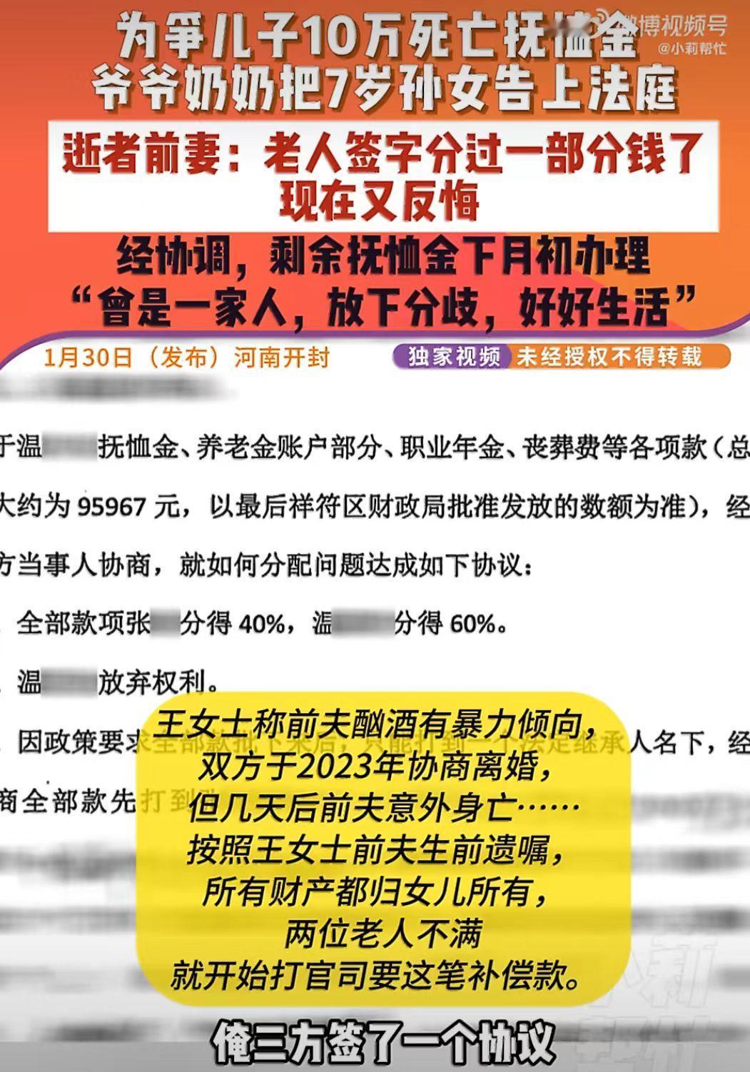离婚5天后,丈夫自杀身亡。 为了10万元抚恤金,爷爷把7岁的孙女告上法庭。 2015年,王女士和丈夫刚结婚,婆婆就说儿子不是亲生的,以后也不要指望我们帮衬你。 不能理解,这是不想帮忙带孩子,还是不想帮衬小家庭? 王女士觉得婆婆这是故意的,就是怕以后有孩子,让她帮忙带,但是为了丈夫也就忍了下来。 2019年,王女士的女儿出生了,办满月酒时,婆婆私下通知亲戚不要孙女的满月宴。 心够狠,这是不是亲生的,就见不到儿子过得好吗? 王女士和丈夫对婆婆也彻底失望了,丈夫也因此长期酗酒,醉了还殴打王女士。 两人最终也因为矛盾、家暴离婚了。 可是万万没想到,王女士的丈夫竟然在离婚后的第5天就自杀了,还留言说房子留给女儿,18岁后过户。 公司给了10万抚恤金,公公婆婆和王女士商议并签了协议,决定孩子拿6万,婆婆拿4万,公公一分钱不要。 结果公公又后悔了,就把7岁的孙女给告了,要求3人分10万。 可是王女士的丈夫遗嘱说了,遗产全归女儿啊! 你觉得这公公婆婆要求分遗产合理吗?抚恤金也属于遗产吗?