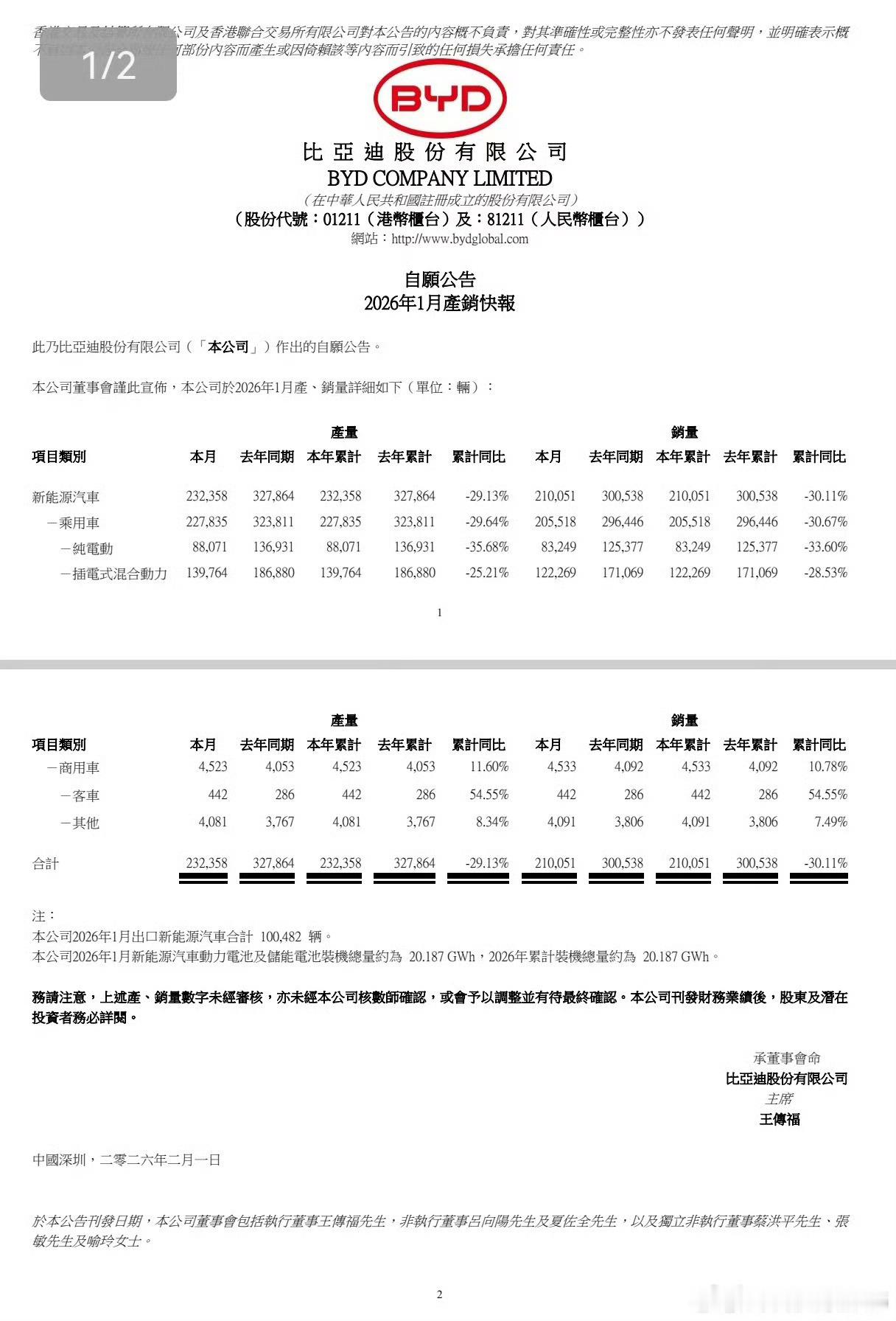 比亚迪集团1月合计销量210,051辆比亚迪品牌177,522辆方程豹21,581辆、腾势6,002辆仰望413辆、海外出口100,482辆海狮06 月销约2.8万辆接替宋Plus成为销量支柱秦系列和海鸥销量也分别为2.5万和2.2万辆