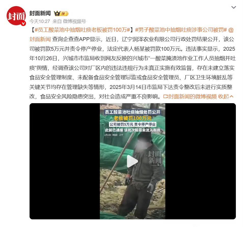 酸菜池里漂着烟头和痰,视频一出,网友直接炸了锅。画面里,辽宁兴城市那哥们穿着胶靴站在池子中央,一手钢叉翻酸菜,一手夹烟,烟灰随手弹进池水,嗓子一痒就低头“呸”一口,动作熟练得像在自家后院。谁看了不骂一句“这酸菜谁敢吃”?评论区瞬间被“老痰酸菜”刷屏,大家边吐表情包边@市场监管局,喊话“赶紧查封”。 舆情像热油里倒水,兴城市市场监管局连夜出动,先把那批酸菜全部扣押,宣布一粒也不会流进市场,随后贴封条把腌渍车间整个锁了。可调查越挖越深,发现事情并不只是“一个工人没素质”那么简单。原来,这片厂区是辽宁润泽农业的地盘,他们把腌池租给了凌海隆盛腌渍菜厂,两边都没派管理人员在现场,工人自由得像放羊;厂里既没有食品安全总监,也找不到一本像样的台账,进货、检验、自查全凭“良心”,地上污水横流,跟垃圾堆只差一个招牌。 早在去年三月,市场监管局就给润泽农业下过责令整改,人家嘴上答应,实际纹丝不动,该没人的岗位继续空着,该脏的地方继续脏,活生生把“整改通知书”垫了桌角。于是这次新账旧账一起算:公司被罚五万元、停产停业,老板杨某个人被拎出来重罚一百万,数字一公布,全网鼓掌,直呼“罚得好”。 有人替老板喊冤,说“又不是他亲自吐痰”。可法律摆在那儿,你收租赚钱,就得对厂子里食品安全负全责;员工没人管,卫生没人抓,到头来消费者买单,不罚你罚谁?一百万听着肉疼,却是给所有食品企业敲警钟:再小的环节,只要关乎吃进嘴的东西,都不能睁一只眼闭一只眼。烟头和痰看似只是恶心,背后却是整个管理体系塌方,今天不管,明天指不定闹出更大的乱子。 现在厂区大门紧闭,机器停了,工人回家,曾经堆成小山的酸菜被一车车拉去销毁,空气中那股酸爽味道渐渐散了,可留给人们的阴影不会立刻消失。大家买酸菜前都会多看两眼生产信息,生怕再踩雷;同行老板也连夜开会,把“禁止吸烟吐痰”写进员工手册,生怕自己成为下一个热搜主角。一个视频、一次重罚,让全行业跟着抖三抖,也算是这池“老痰酸菜”带来的唯一正面作用了。酸菜腌酸菜 臭酸菜 辽宁老痰酸菜 来源:封面新闻