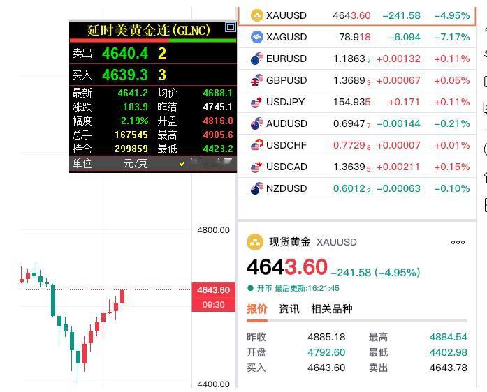 下午金价探底企稳, 虽然黄金一度跌至4400美元附近。 伦敦金和纽约期货黄金略有差距, 伦敦金(现货黄金)最低4402.98美元, 纽约期货黄金(国际金价) 最低跌至4423.2美元/盎司。 不过现在都有所反弹, 国际金价报价4641.2美元, 现货黄金4643.6美元。 两者基本持平, 从低位反弹二百多美元, 是否说明黄金跌势将放缓, 有望企稳反弹呢? 节前,期货小褚还是认为, 有上攻5000--5100美元的可能!
