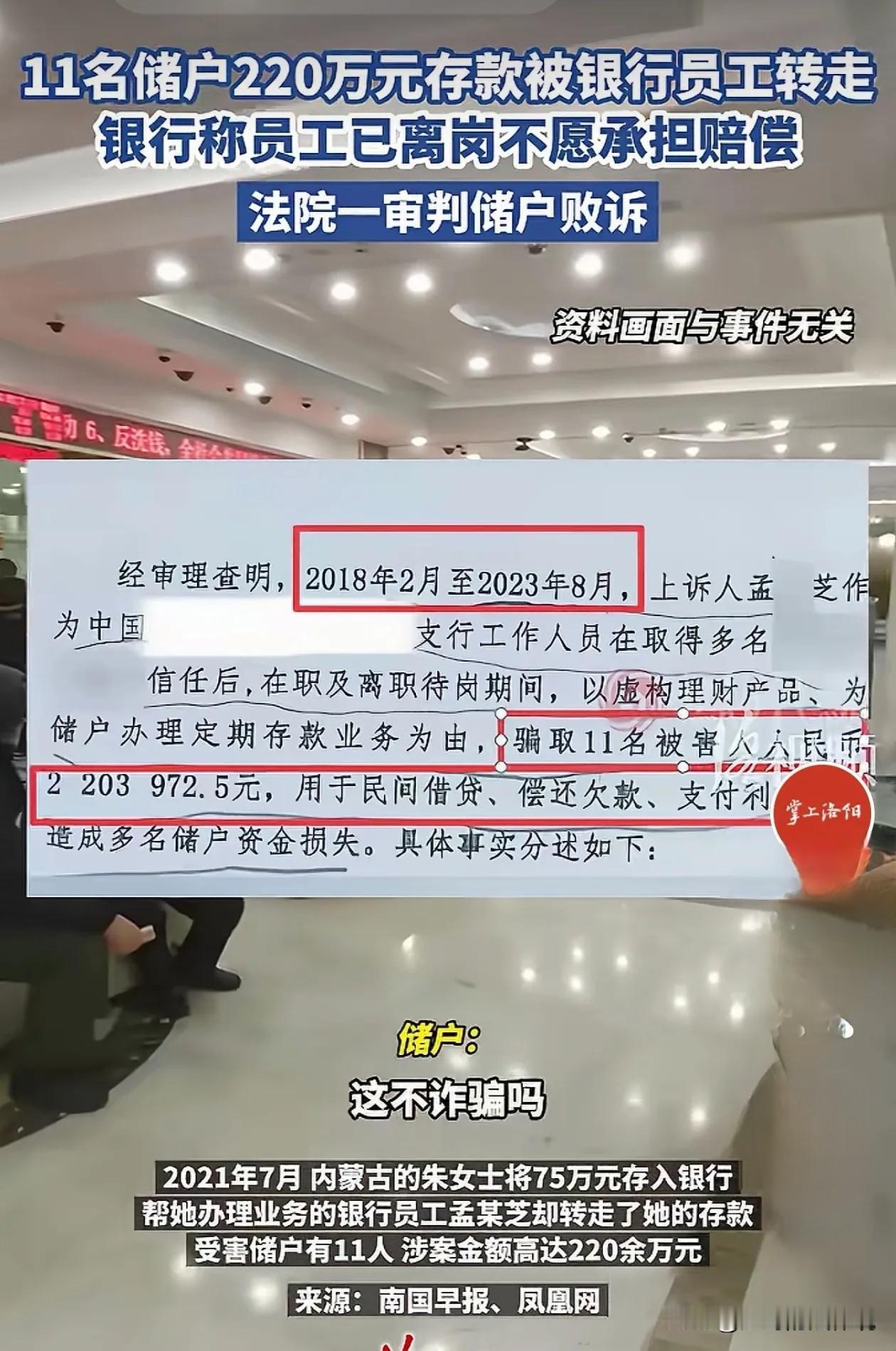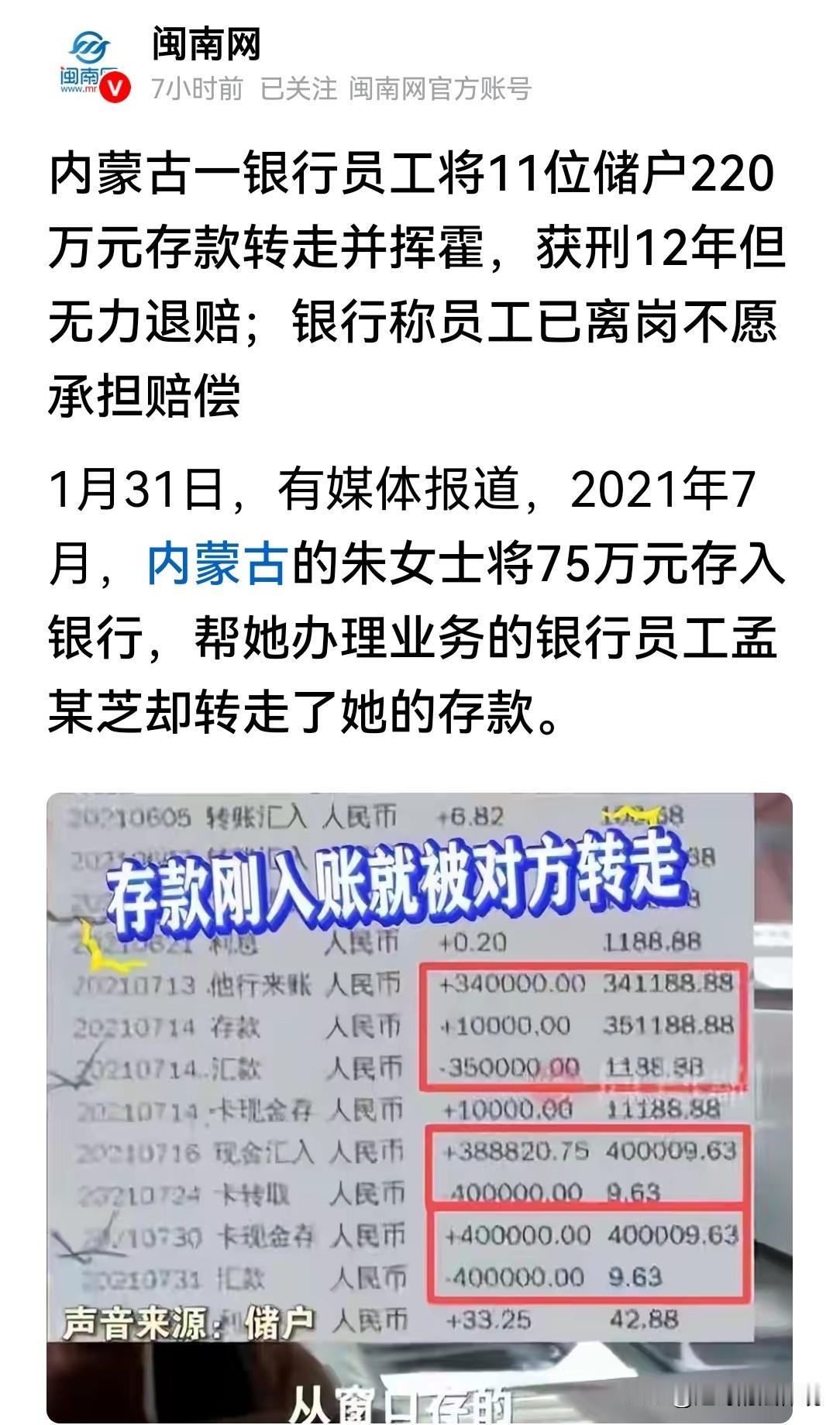 内蒙古呼伦贝尔,女子拿了75万去银行窗口存钱,不成想,一场精心策划的骗局正等着她上钩。不久,银行员工就偷偷把75万转走,女子找银行讨说法,得知还有11名储户的钱,被同一员工转走,总计220多万。银行表示,员工已被开除。大家告上法庭,要求银行赔偿存款,然而,判决结果令所有人意外! 天塌了!11位储户接连发现,自己存在银行的钱,莫名其妙地不翼而飞。 这些钱被同一个人,该行的大堂经理孟某芝,利用职务之便挪走了。 2021年,朱女士手里有75万,想着银行存款比较安全,还能吃利息。 她是在柜台办理的存款,而给她办手续的正是孟某芝。 张女士也在该行存了76万多元。 还有其他9位受害者,也各有数万,到数10万元不等,同样存在这家银行。 为他们办理手续的,同样是孟某芝。 当时孟某芝担任银行的大堂经理,很多老储户对她都非常熟悉和信任。 正是利用了这份信任,孟某芝从2018年2月开始,一直到2023年8月。 在长达5年多的时间里,以内部有高息存款、储蓄行保险等她自己编造的业务为名。 在银行的VIP客户室,或者银行大堂,指导储户办理所谓的存款。 随后,她会以需要补签单据、完善手续等理由,骗取储户在转账凭证等文件上签名。 随后神不知鬼不觉地,把钱转到她早已控制好的、用同学、朋友或亲戚名字开的账户里。 大多储户,因为太过相信她的银行经理的身份,根本没有仔细看要签的是什么。 甚至完全不知道,自己的钱已经被转到了别人的账户里。 直到后来警方找上门,或者存款到期,却取不出钱时,他们才惊觉上当。 孟某芝骗来的钱,都被她用于和男友一起经营的小额贷款公司周转、个人投资以及日常的高消费。 为了不让骗局过早暴露,她采用“拆东墙补西墙”的办法。 在部分储户的存款到期前,把本金和承诺的高额利息转回去。 以此骗取他们继续存入更多的钱,甚至介绍新的储户给她。 更让人难以理解的是,银行内部的管理漏洞,为她的长期行骗提供了条件。 监管部门的调查指出,这家银行,在内控管理和员工行为排查上,存在严重问题。 实际上,孟某芝早就在2021年1月,因为违规在外面兼职,被银行要求离职待岗。 但离谱的是,在此后长达2年多的时间里,她依然穿着银行制服,接待客户、办理业务。 继续进行她的诈骗活动,直到2023年8月才被正式开除。 这期间,没有任何有效的内部监督机制阻止她。 骗局终究有崩塌的那一天! 随着储户们陆续发现存款异常并报警,孟某芝最终被抓。 2024年10月,法院以诈骗罪判处孟某芝有期徒刑12年。 同时责令她退赔被害人的损失。 问题来了!孟某芝早已将钱财挥霍一空,根本没有能力,偿还这200多万元的巨款。 为了追回血汗钱,受害的储户们,只能将存款银行告上法庭,要求银行承担赔偿责任。 然而,这场维权之路走得异常艰难! 2025年4月,法院对一位70岁的孙女士的案件,作出一审判决。 认为通过ATM机转账,需要输入密码,储户本人存在重大过失,因此驳回了她的诉讼请求。 孙女士不服提起上诉。 她还提交了关键的账户明细,显示有两笔时间仅间隔42秒的ATM转账操作。 以她的年龄,和对机器的不熟悉程度,根本不可能由她本人完成。 2025年8月,二审采纳了这一证据,做出改判,判决银行支付孙女士4万元本金,及相应的利息。 这个案例给了其他储户一些希望,但每个人的具体情况不同。 截至2026年1月,其他储户的官司仍在进行中。 损失最大的朱女士,她起诉银行,索赔75万元的一审已经败诉。 上诉案件在2026年1月5日开庭,目前还没有宣判。 张女士的案件,则安排在同年的2月上旬,进行一审开庭。 《民法典》第1191条第1款:用人单位的工作人员因执行工作任务造成他人损害的,由用人单位承担侵权责任。用人单位承担侵权责任后,可以向有故意或者重大过失的工作人员追偿。 这条法律的意思是,如果员工在工作中伤害了别人,责任由公司承担。 1、员工行为是否属于执行工作任务? 孟某芝作为银行大堂经理,在银行VIP室或大堂,利用银行制服、职务身份和设备,以“高息存款”名义诱骗储户转账。 这些行为与她的职务高度相关,属于“执行工作任务”的范畴。 即使她后来被开除,但挪用行为发生在在职期间,银行仍需为其行为负责。 2、银行能否以员工个人行为,或已开除为由推脱责任? 法律规定,公司不能以员工个人行为,或已开除逃避赔偿。 因为员工是在为公司工作时造成的损害,公司通过员工的职务行为获利,就应当承担风险。 3、储户为何需要警惕自身过错? 如果储户主动泄露密码、轻信高息诱惑或未核对文件,可能被认定为有过失,从而减轻银行责任。 而对于众多储户的诉讼,银行方表示,如果法院最终判决银行需要承担责任,他们会依法履行判决。 对此你怎么看?