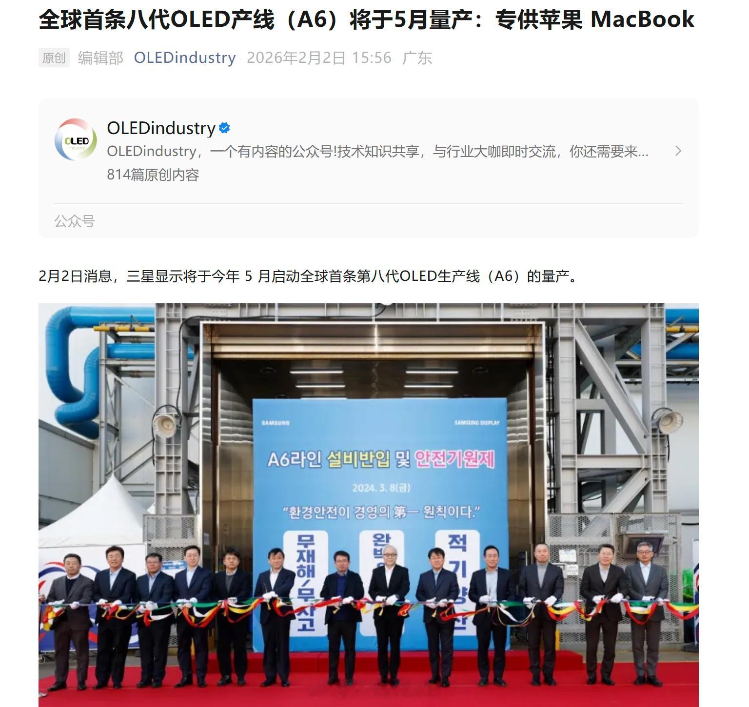 三星显示宣布 5 月启动全球首条第八代 OLED 生产线(A6)的量产,主要是为苹果独家打造首批 OLED MacBook 面板,适配 14 英寸和 16 英寸机型,相关产品预计于今年第四季度发布。