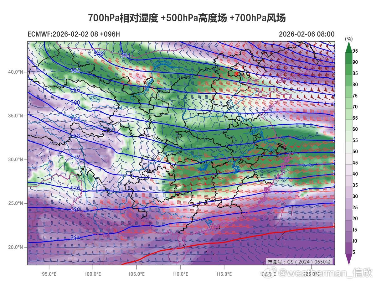 图4-6也叠加了500百帕高度场和850百帕风场预报。图7-9为700百帕风场+相对湿度+500百帕高度场叠加。这次欧洲报的低空南风依然是各家最强,给出的总降水量和降雪量也大于其他模式。但是因为500百帕环流比较平直,没有深槽,因此700百帕明显向北翘的西南风和低空850百帕西南急流的合理性,存疑。