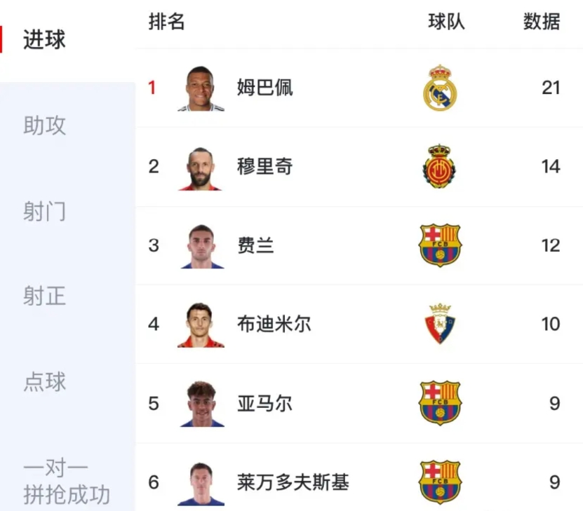 皇马本轮打个巴列卡诺都这么费劲,最后靠着超长加时姆巴佩点球绝杀,继续保持对巴萨的紧逼!姆巴佩目前射手榜稳居第一,而且是一骑绝尘,领先第二名7球!