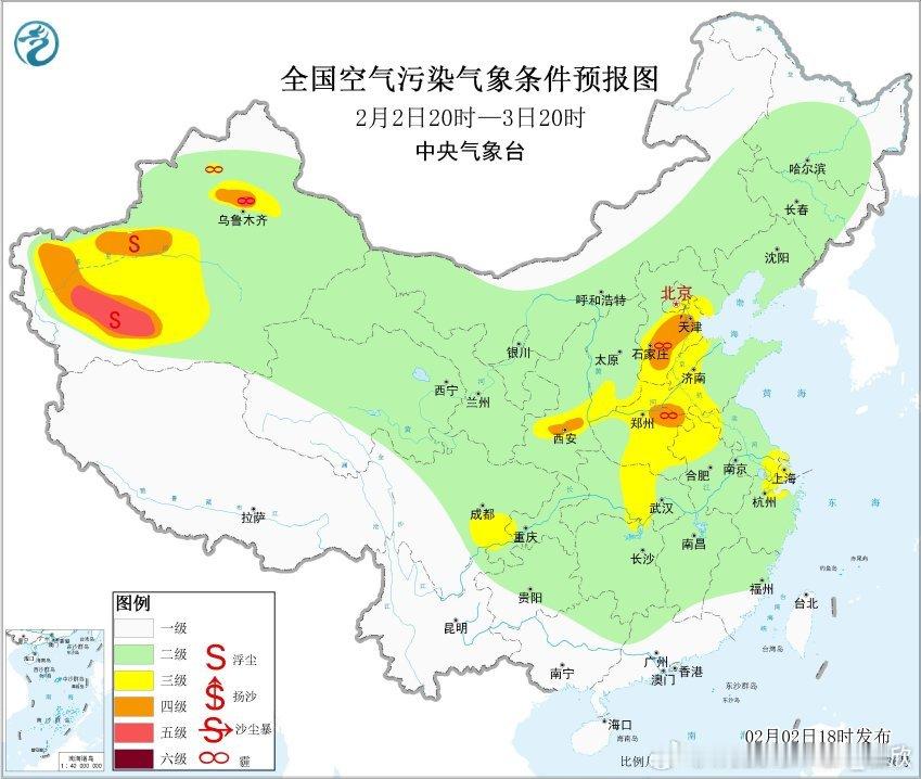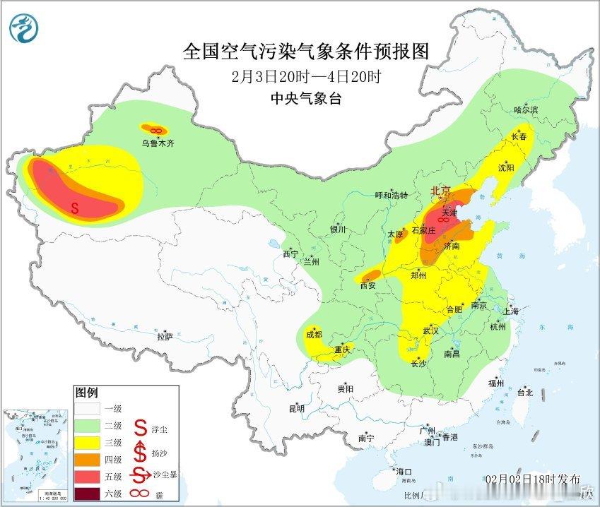从空气质量看,今天山东一带的污染减弱南下。但今晚到明天,转为地面高压后侧的南风,污染和霾可能再次聚集并向北传输。预计2月2日夜间至4日,华北中南部、黄淮中西部、汾渭平原、江汉等地的部分地区有轻至中度霾,其中,4日华北中南部局地重度霾。5日起,受冷空气影响,上述地区霾天气自北向南逐渐减弱消散。