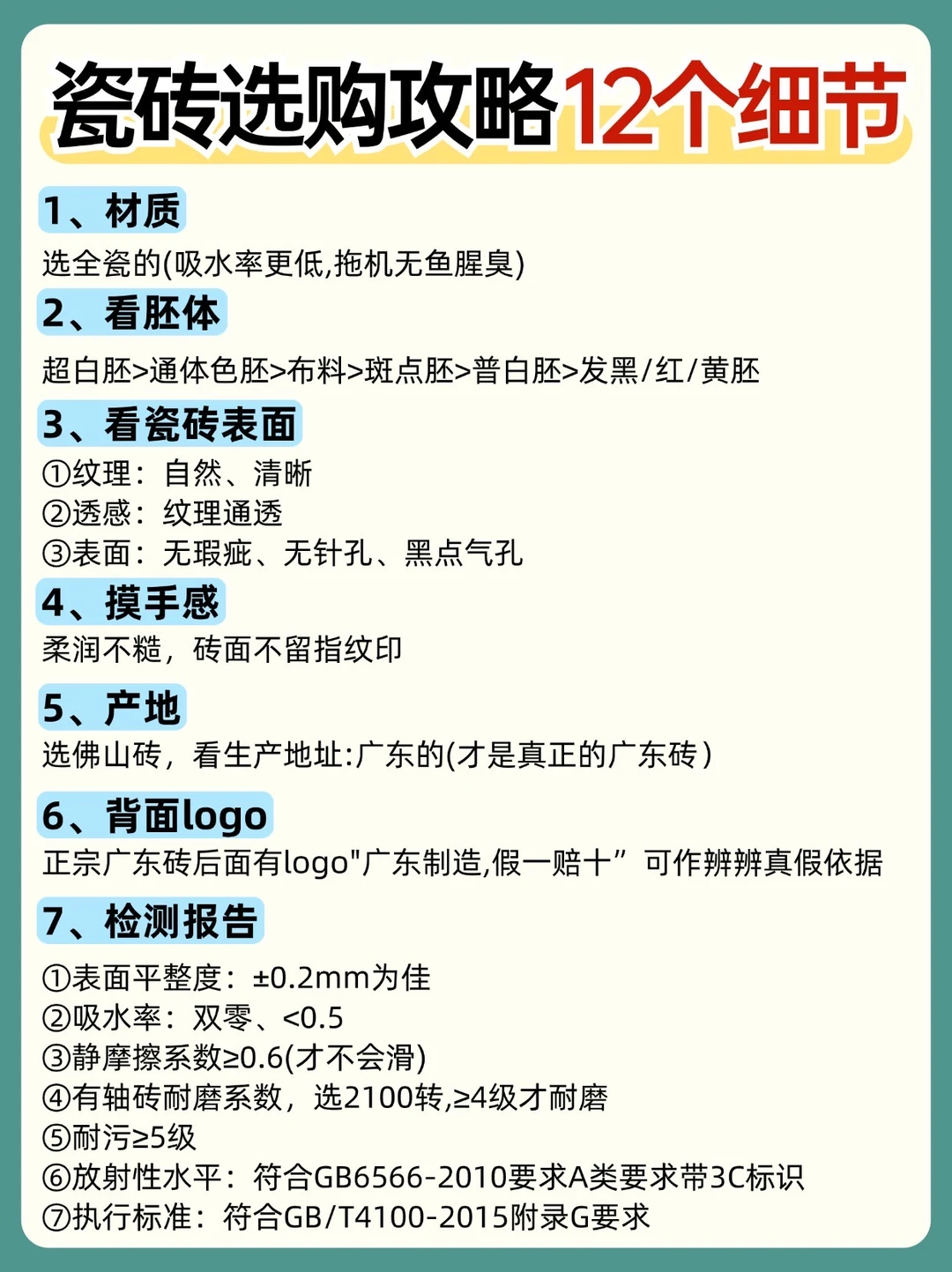 ⚠️全屋瓷砖选购千万要谨慎,前期做好攻略,后期入住才不踩坑!✅熬夜把瓷砖怎么选,给一次性说清楚了,照着选美观耐用,性价比高,省钱不踩坑! [爆炸R]瓷砖 1、敲声音:好砖声音通透清脆不闷 2、摸瓷砖边缘:一般来说越光滑代表瓷化程度越高,底胚的硬度和密度也越高 3、看背面胚体:倒点水等一会,选没有明显吸水的,胚体有黑斑的一般不是零吸水的,发红的不是广东砖 4、看重量:重的呢,不一定质量好,但质量好的一定重 5、用笔试:拿油性马克笔画了擦,但注意这个有时候你去逛瓷砖店没有那么多时间等待放置 30分钟以上,遇到 比较有意向的可 以要个小样回家测试一下,比如用水擦不掉的,用酒精、洗洁精能擦掉的一样没有问题 [爆炸R]包装 1、看附录执行标准,附录是国家根据瓷砖不同吸水 率分成的不同标准,地砖一定要选附录G的,墙砖附 录H的也可以用,其他的就不要考虑了 2、看3c认证,记住这个是对复合附录G也就是吸收 率小于等于0.5的瓷砖的强制性认证,所以如果是其 越小的平整度越好 3、看吸水率,0.5是国标附录G的最低要求,真正的吸水率小于等于0.5的瓷砖的强制性认证,所以如果是其 他附录的没有这个认证也是没问题的 4、选广东砖的,看生产地址,记住不要看成经销地 址 [爆炸R]检测报告 1、看表面平整度:标准要求士2mm的算合格,数字双零吸水砖这个数值都非常低接近于零 2、看破坏强度和断裂模数:数值越高越不容易崩瓷 破损 3、看耐污染性和化学试剂,认准5级和GA级就很优 秀了 4、看摩擦系数,想防滑的就选0.6以上的 6、放射性就看是不是A类 [爆炸R]与商家确认 1、切角加工是否免费,比如海棠角有的厂家加工非 常便宜,但是瓦工会多收费用; 2、是否包送货,步梯的一定问好是否包上楼,不送上楼需要提前联系上料工人; 3、检查是否有破损; 4、多出来退的是单片能退还是整包才能退,少了补 货还是不是一个批次的以免有色差; 5、仔细核对价格和产品批次; 6、随机撕开几包检查和样品砖是否一致