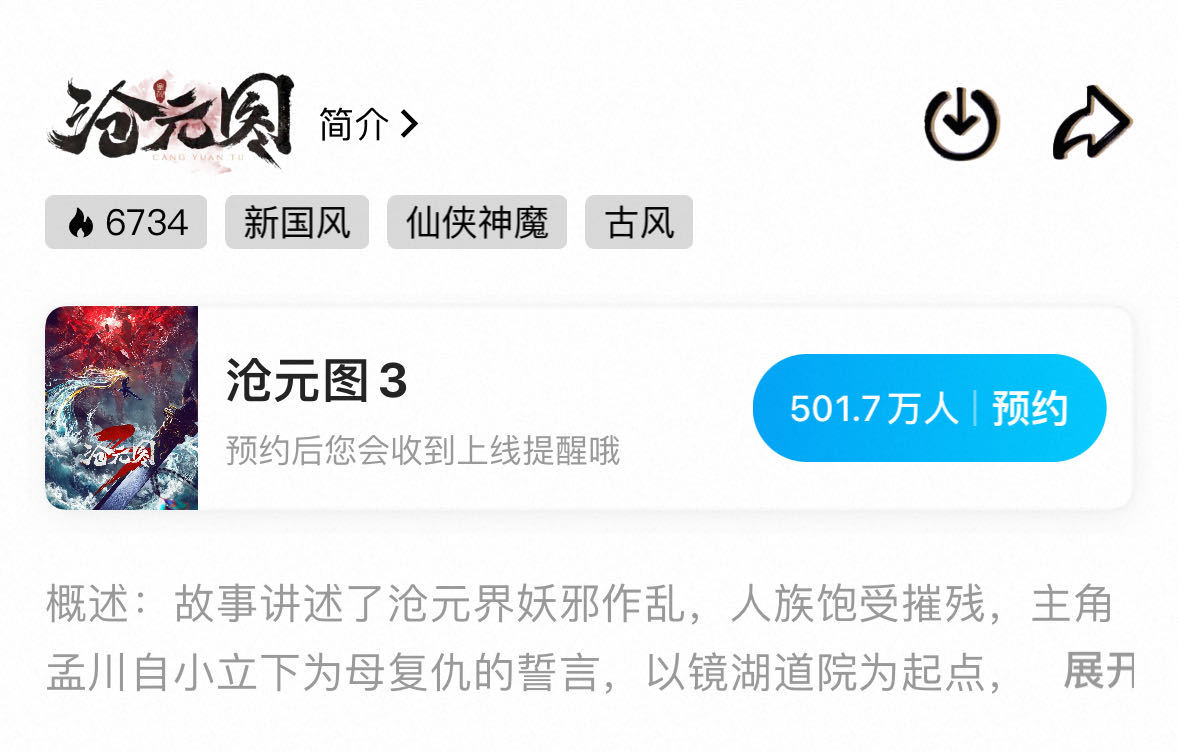 沧元图3预约破500万沧元图3微博和优酷站内双端预约破500万了!恭喜这个小沧!!第三季pv也有了,感觉剧情和特效都更牛了!期待2026年的第三季!