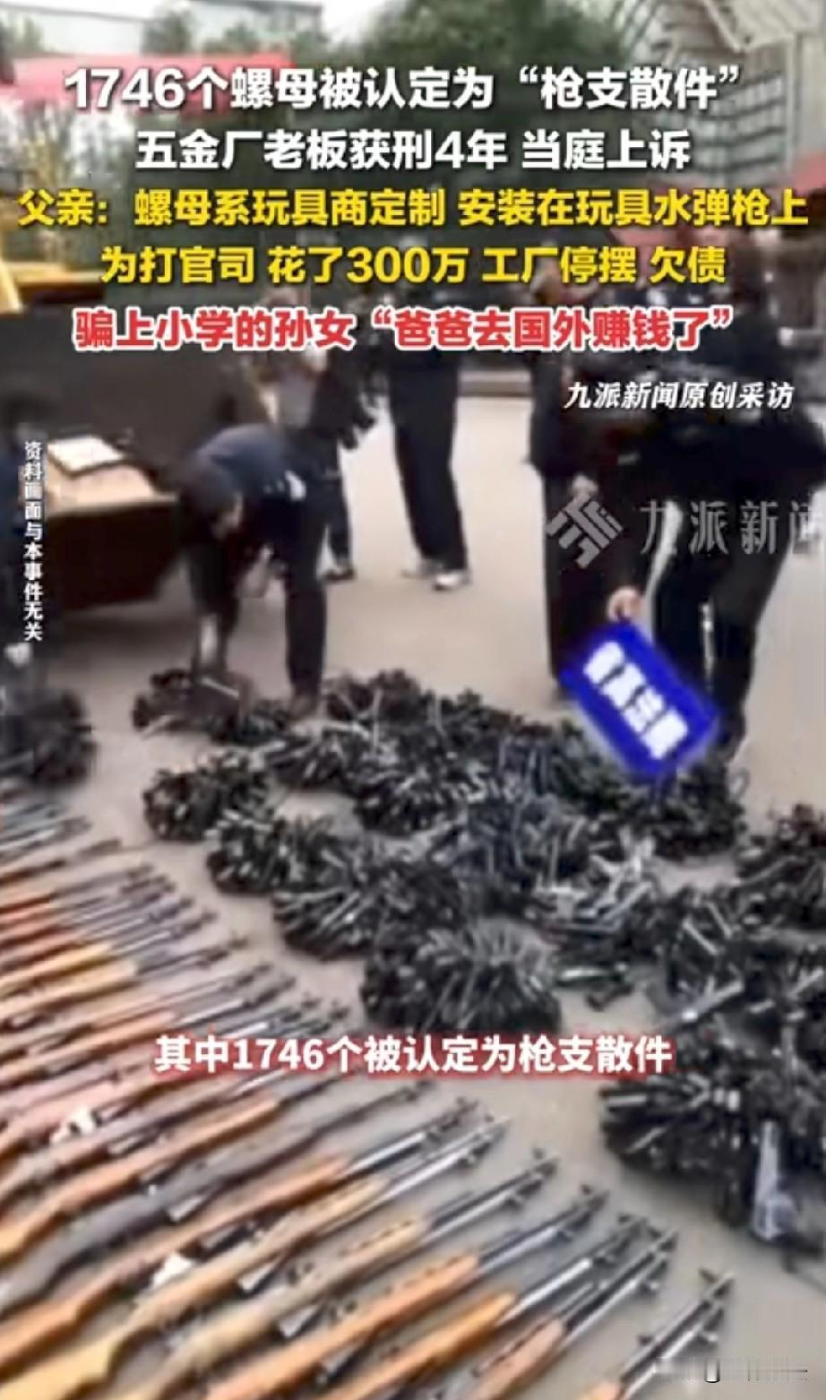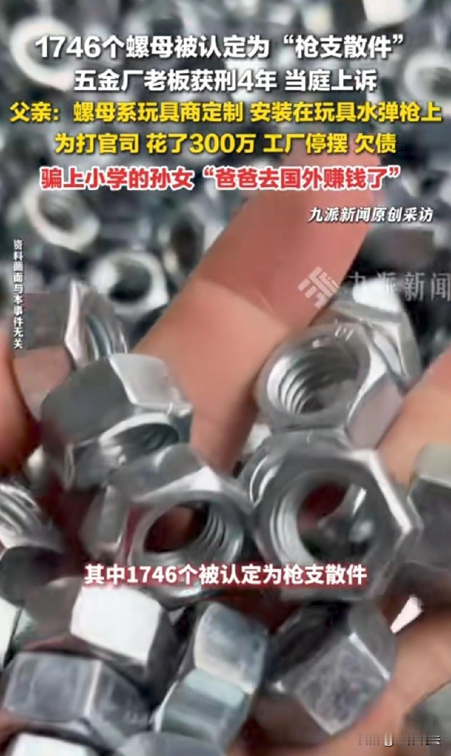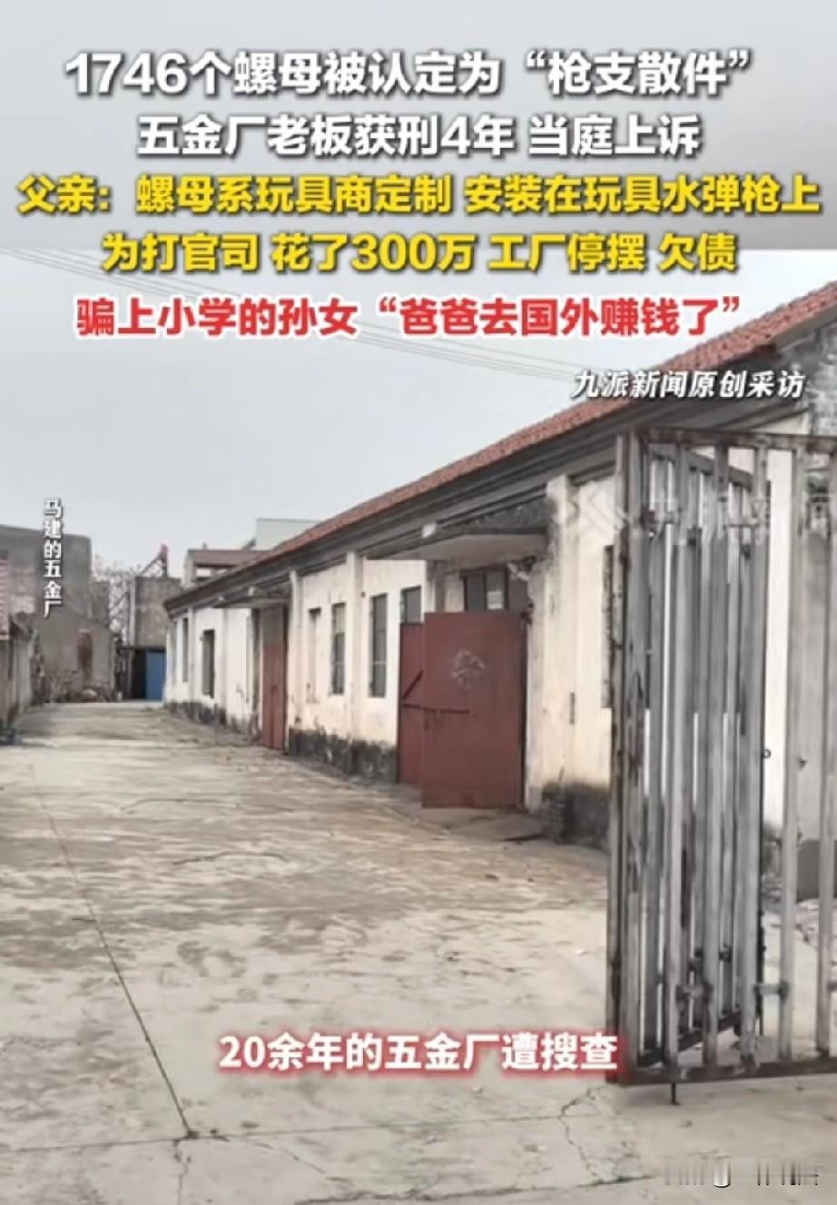 江苏南通,五金厂老板定制了一批螺母,专门用在玩具水弹枪上,并在网上售卖。谁知,警方突然上门搜查,带走了1977个螺母,其中1746个竟被认定为“枪支散件”,老板也因此被带走。警方表示该螺母与某步枪枪管螺母尺寸基本一致,可以互换,但庭审测试时,却根本拧不上。不过老板还是被判刑4年。老板父亲觉得冤枉,四处奔走,花了300多万,只希望为儿子讨回公道。 马建经营着一家五金厂,一晃20多年过去了,工厂在当地也算小有名气。 儿子马晓强大学毕业后,便接手了父亲的工厂,年轻人有想法、有冲劲,引入了数控设备,想跟上时代步伐。 2019年的时候,一位玩具商找到马晓强,定制了一批用于玩具水弹枪的螺母。 马晓强觉得这是个不错的业务,之后还在1688平台上开始销售同类的螺母产品。 那时候的他,怎么也没想到,这些小小的螺母,日后会给他和整个家庭带来一场巨大的灾难。 2022年6月,警方突然上门搜查工厂,带走了1977个螺母。 很快,马晓强也被带走,马建一下子慌了神,原来被带走的1746个螺母,后来被鉴定为“枪支散件”。 清清白白经营工厂造螺母,怎么会和“枪支”扯上关系呢?他拿着图纸指出,儿子生产的螺母和公安部枪支图谱里的部件根本就不一样。 2023年7月,检察院以非法制造、买卖枪支罪对马晓强提起了公诉。 公安鉴定认为,涉案螺母与某步 枪枪管螺母尺寸基本一致,可以互换,但在庭审当庭测试的时候,却根本拧不上。 既然当庭都拧不上,那是不是就应该当庭将人释放呢? 马建心里燃起了一丝希望,觉得儿子这下应该没事了。 但依据《刑法》第125第一款规定:非法制造、买卖枪支、弹药、爆炸物的,处三年以上十年以下有期徒刑;情节严重的,处十年以上有期徒刑、无期徒刑或者死刑。 非成套枪支散件按每30件折算为1支枪,数量达标即入罪并可升格量刑。 所以,一审法院判决马晓强有期徒刑4年。马晓强难以接受,当庭提出了上诉。 从那以后,马建就开始为儿子四处奔走。为了打官司,前前后后花了300多万,不仅花光了家里的积蓄,还欠下了不少债,工厂也因为这件事停摆了。 62岁的他,已经满头白发,他不敢把真相告诉上小学的孙女,只能骗她说爸爸去国外赚钱了。 每次看到孙女天真无邪的笑容,马建的心里就像刀割一样难受。 如今,二审的时间还没有确定,马建只能继续等待,期盼二审能有个好结果。 不过在本案中,涉案螺母为玩具水弹枪定制、当庭实测无法装配于制式枪管,互换性与专用性不成立。 且行为人公开经营、按玩具订单生产,无证据证明具有涉枪犯罪故意,关键鉴定与庭审实测矛盾未排除合理怀疑。 在对象属性、主观故意均存疑的情况下定罪,有违罪刑法定与主客观相统一原则,二审存在改判空间。 可未来的路究竟会怎样,马建心里也没有底,但他始终相信,正义也许会迟到,但不会缺席。