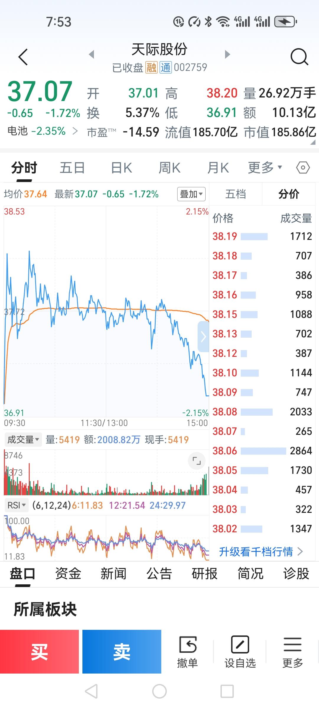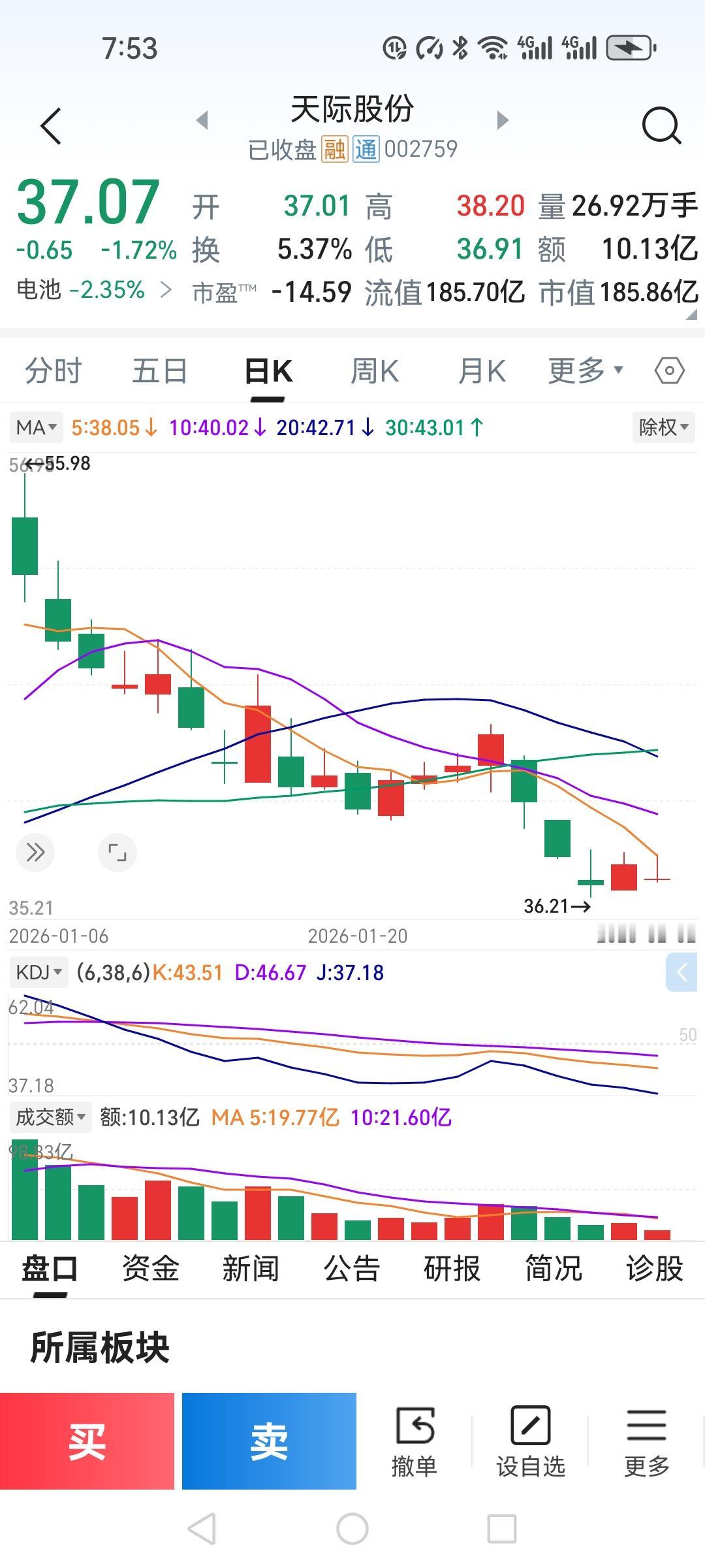 2月份股市开门黑,你们说是好事还是坏事。 上周连续两天的回血,今天一下亏进去一半,这真是一夜回到了解放前。 天际股份开盘37.01,下探36.91,冲高38.2开始掉头向下,反复震荡,快收盘时快速下跌,毫无抵抗力,收在37.07比开盘多6分钱,全天成交量10.13亿,明显的缩量,换手率5.37%, 本来想在开盘时买入,结果又犯了老毛病,还想再低点再买,没想到他刚一探底就开始上升,最高冲到38.2,然后又开始下滑,我也只好放弃,后来我看股价一直在37.6到37.9之间徘徊,在下午开盘以后,我看到股价有跌到37.6的可能,我就挂单买入,我看着卖盘的出现,感觉有可能跌破37.6,继续下跌,我就赶紧撤单,还好撤单及时,要不是增加了亏损。 炒股不但要有胆量还要机智灵活,我要是不反应的快,真是后果不堪设想,你们说是不是? 明天的走势不知道怎么样,会不会来一个触底反弹,还是继续下跌,但愿不要把我们刚刚回复的心灵,再次受到伤害。个人日常炒股记录,不存在任何操作建议,股市有风险,投资需谨慎。天际股份股票 你觉得黄金暴跌是买入的好时机吗 天际短剧