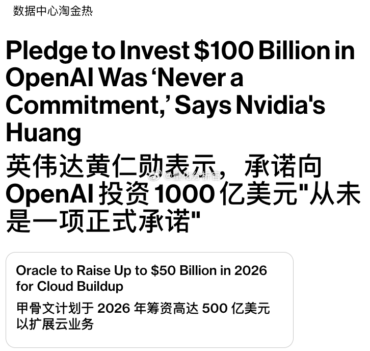 英伟达黄仁勋:我从来没说过要投资1000亿!甲骨文:2026计划圈500亿美元