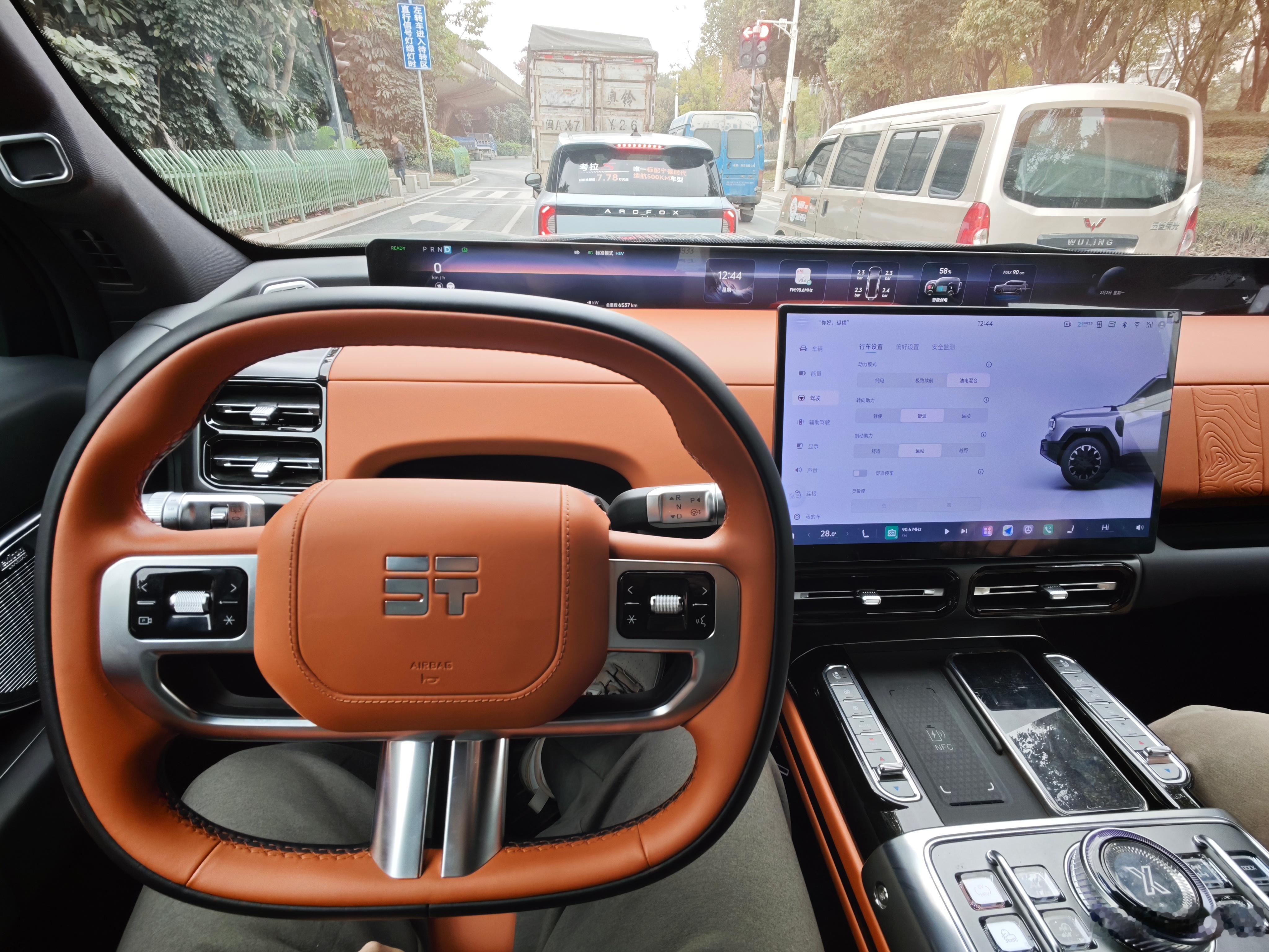 内饰设计很有新意,也运用了类似天际屏的设计,虽说一个长条有点突兀,但定义自由度和功能性都不错。方向盘做成了类橄榄型,明显是为了不遮挡天际屏的视野,但这样握感就不太好了,特别是大角度打方向的时候,感觉越野车还是需要一个比较圆的方向盘,不过适应了就还好,总比半个好