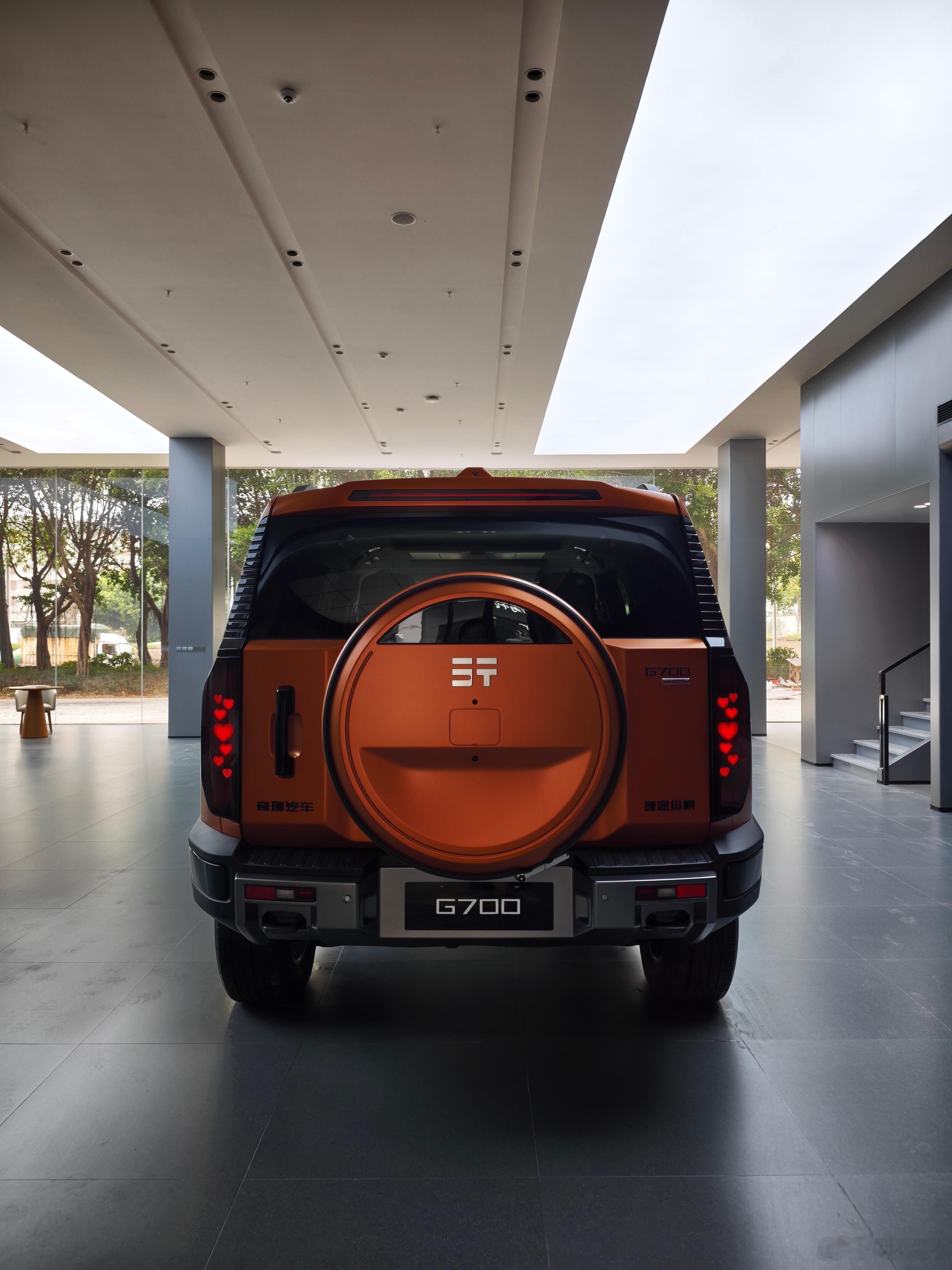 深蓝色的外观搭配浅灰色内饰是我最喜欢的配套,外观虽说方方正正,但质感很强,漆水也很靓,在外驾驶时回头率不低。内外运用的都是机械门把手,非常好,高配尾灯可以自定义文字图案,这台橙色展车点满了红色爱心桃,和硬派的车身设计形成了奇妙的反差感。