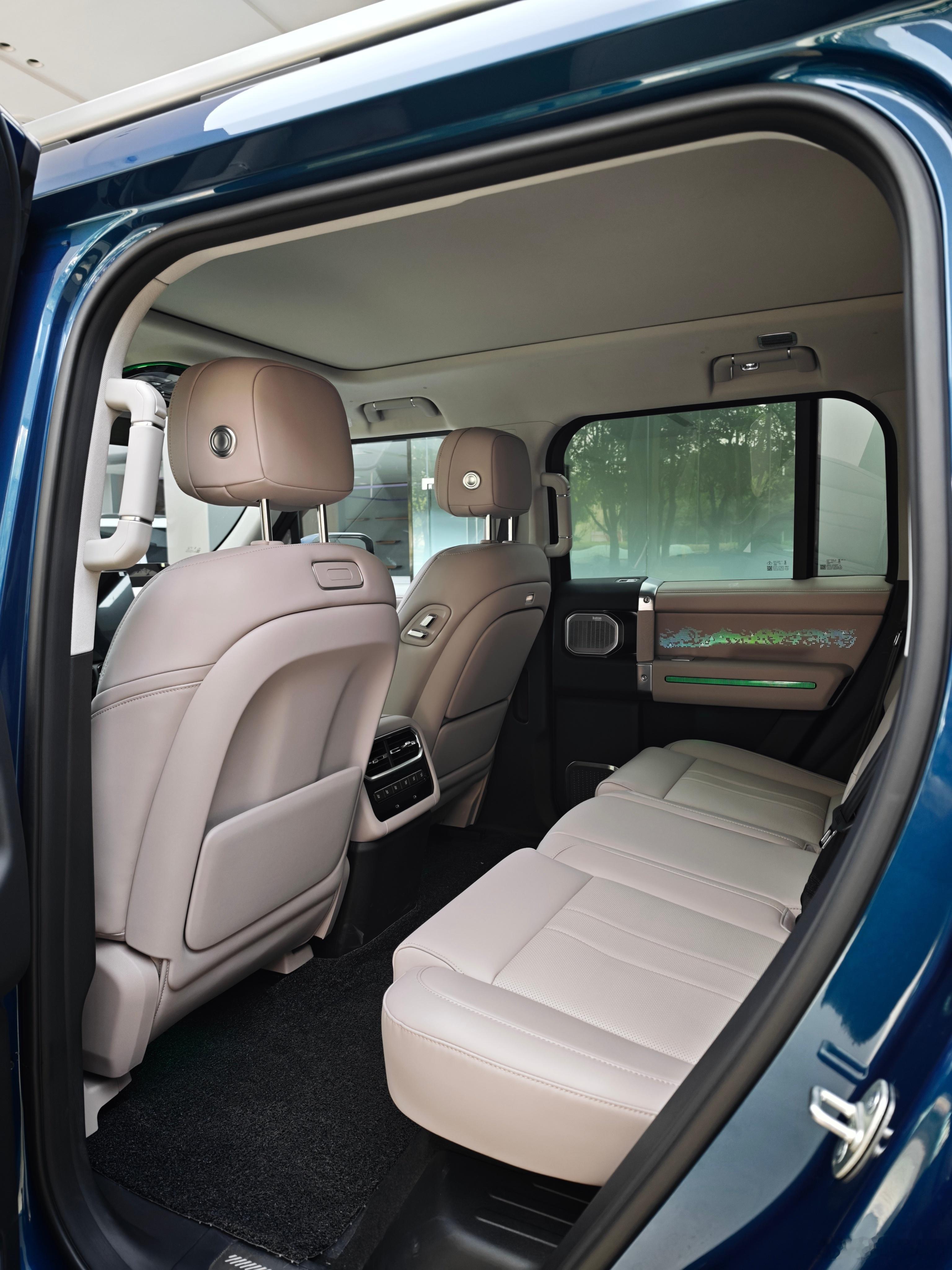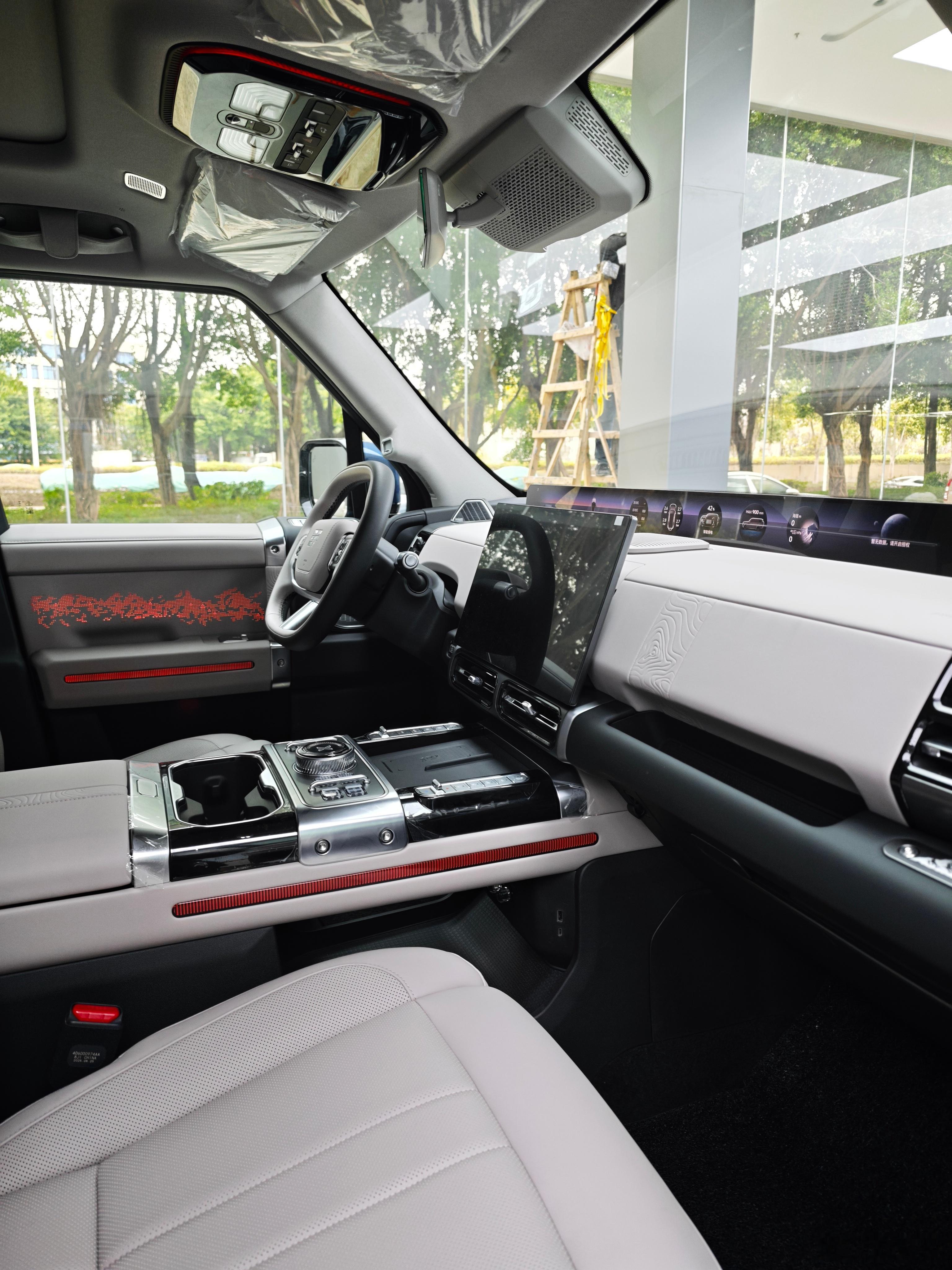 展车有两台都是32万多元的版本,也是最主销的车款,今天开的试驾车也是这个配置,不带空气悬架,更适合改装或是拿去豁。我个人也认为这个配置性价比最高,该有的配置都有,有基本的L2、莱斯康音响、四座通风加热按摩,缺少冰箱、电视和智驾系统,个人觉得必要性不强。