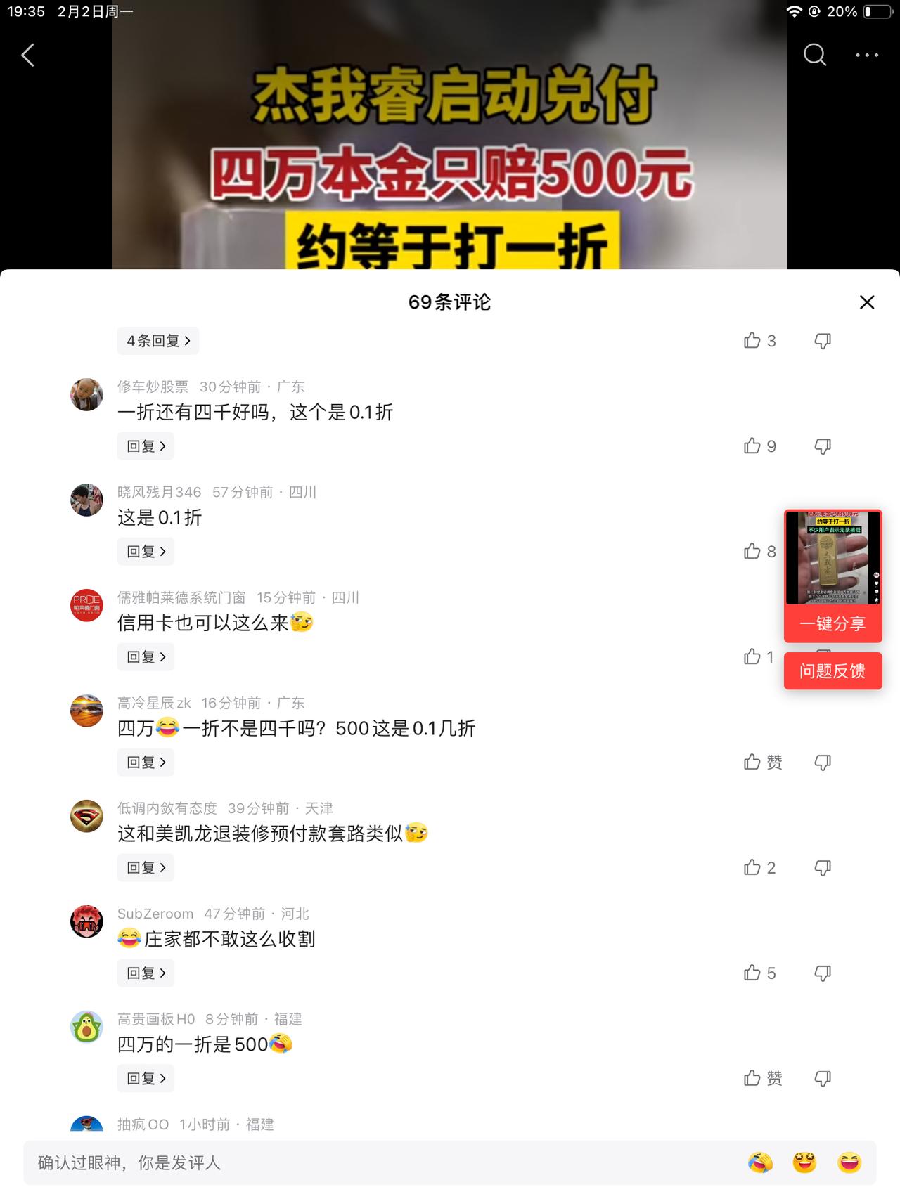 四万的一折是400?四万本金给500块。这个投资真靠谱。这个一折也很耐人寻味,四万的一折不是4000吗?这个500是怎么折的能折到一折?赔大了,他们能同意吗?不同意的话是不是500都拿不到了! 投资界有句话劝人不投资是这样说的,你看重的是别人的利息,别人看重的是你的本金。当然,这个一开始的诱惑力是很大的,就怕波段太大,老板顶不住。现在跌了一些,老板还愿意回来交付,看来是没有跑出去。 跑出去了也不见得是条活路。看甜甜圈就知道了,外面风景也不过如此。