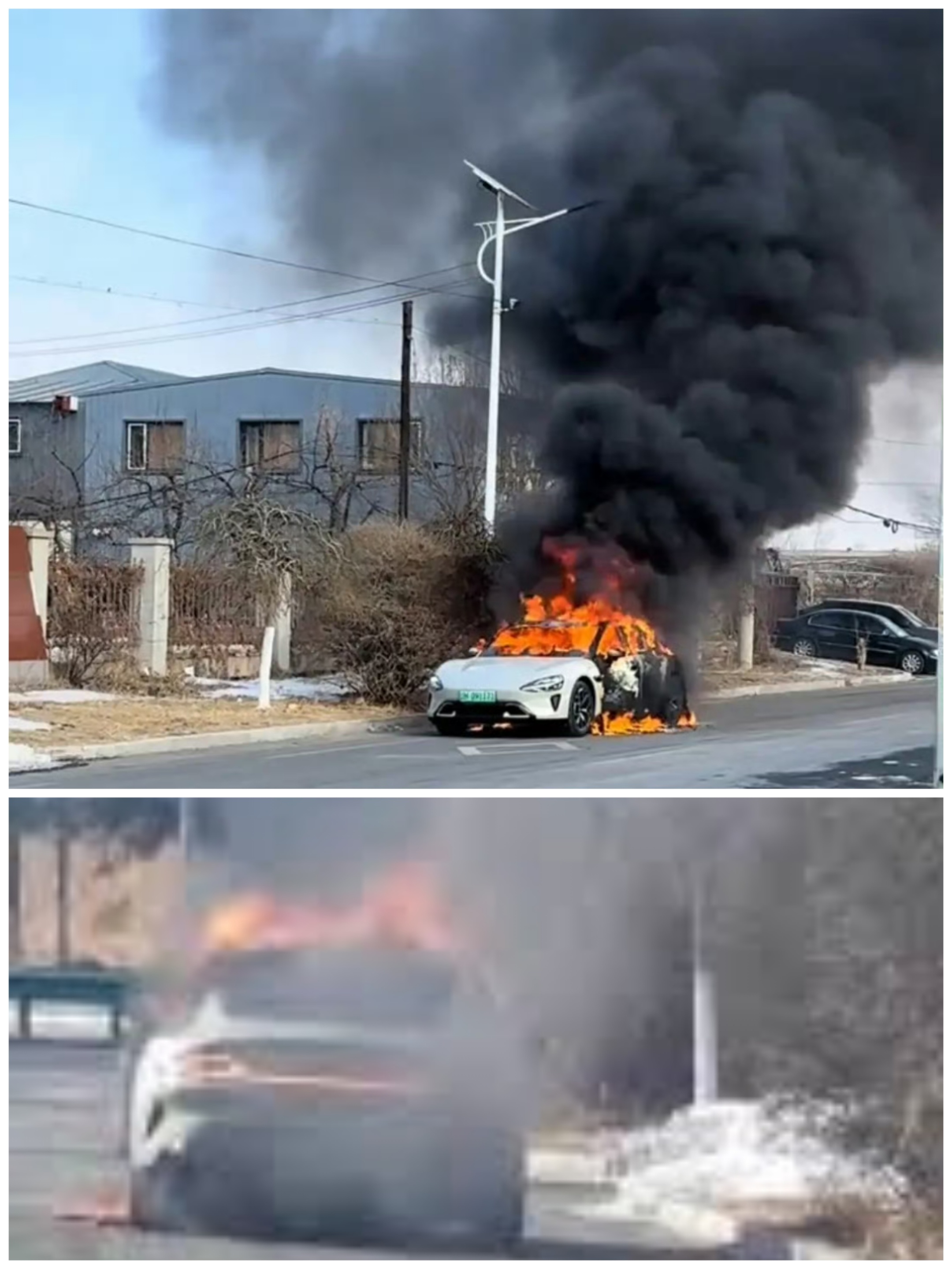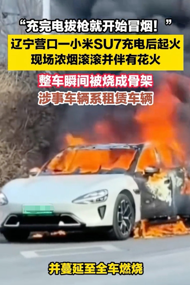 2月1日,辽宁省营口市一辆小米SU7新能源车在充电完成后,车主拔出充电枪时中控台突然冒烟,车主紧急将车辆停在路边并逃离,随后几分钟内车辆发生起火爆燃,现场无人员受伤。从现场视频来看,起火时车辆大灯正常供电,说明动力电池完好,并不是电池自燃。