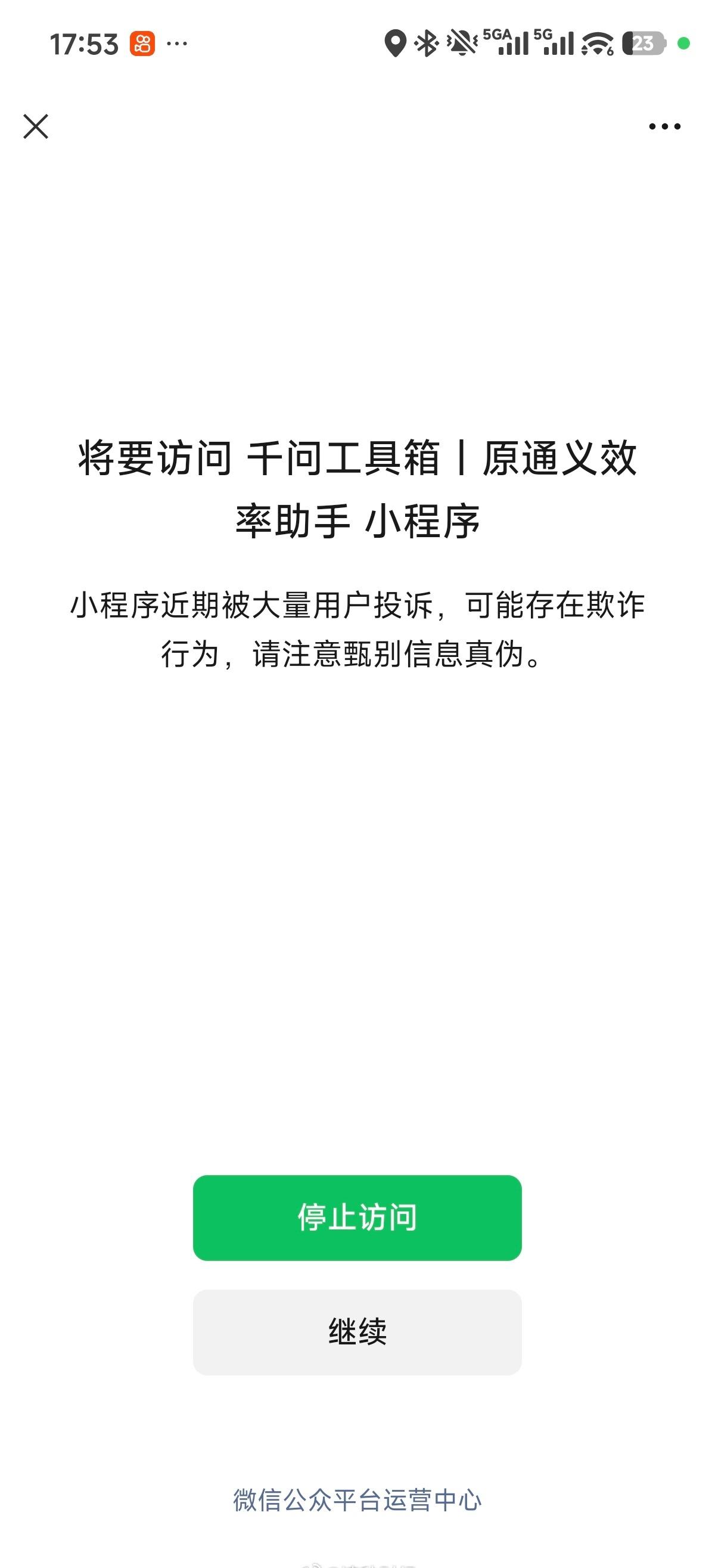 【千问旗下小程序被微信风险提示】千问工具箱小程序被微信风险提示 2月2日,@读秒财经 搜索发现,“千问工具箱丨原通义效率助手”小程序被微信提示:小程序近期被大量用户投诉,可能存在欺诈行为,请注意甄别信息真伪。点击“继续”后,弹出“关于防范养生课程欺诈的提示”页面,小程序内部功能仍可正常使用。各位网友,您怎么看?