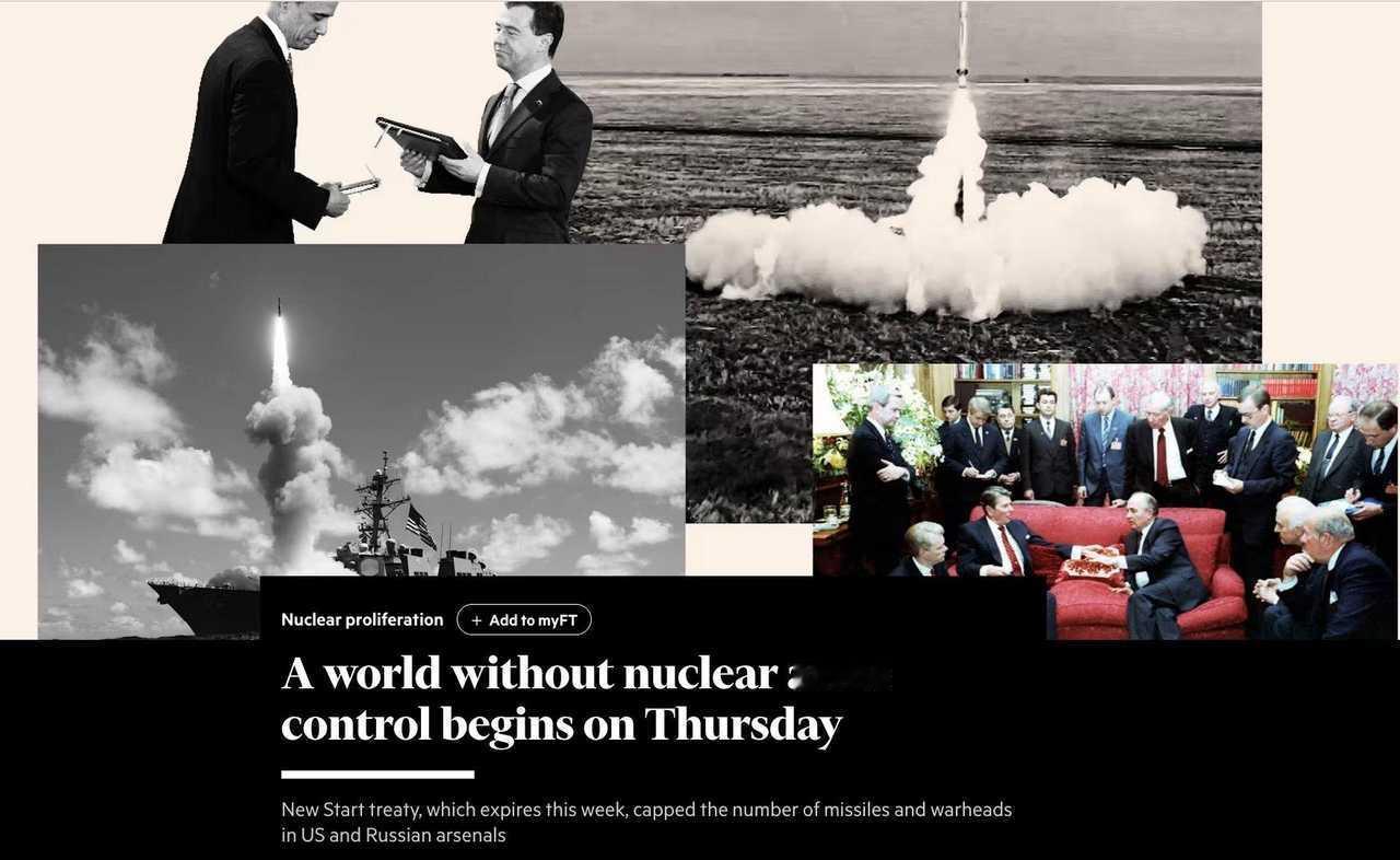 美国与俄罗斯之间的最后一项主要核军控条约将于周四到期。该条约规定了核弹头的最大数量上限(不超过1550枚),限制了运载系统的数量(不超过700枚),并确保了核武器透明度(包括各方拥有的核武器数量及存放地点)。此后,自上世纪70年代以来,两个核大国之间将首次没有任何生效的核裁军条约。