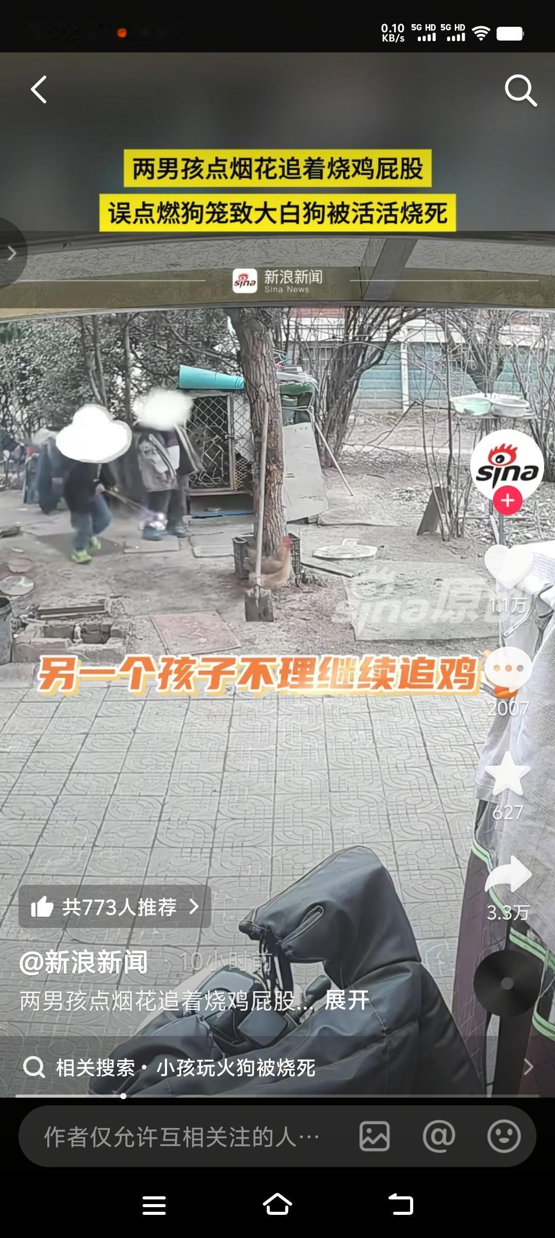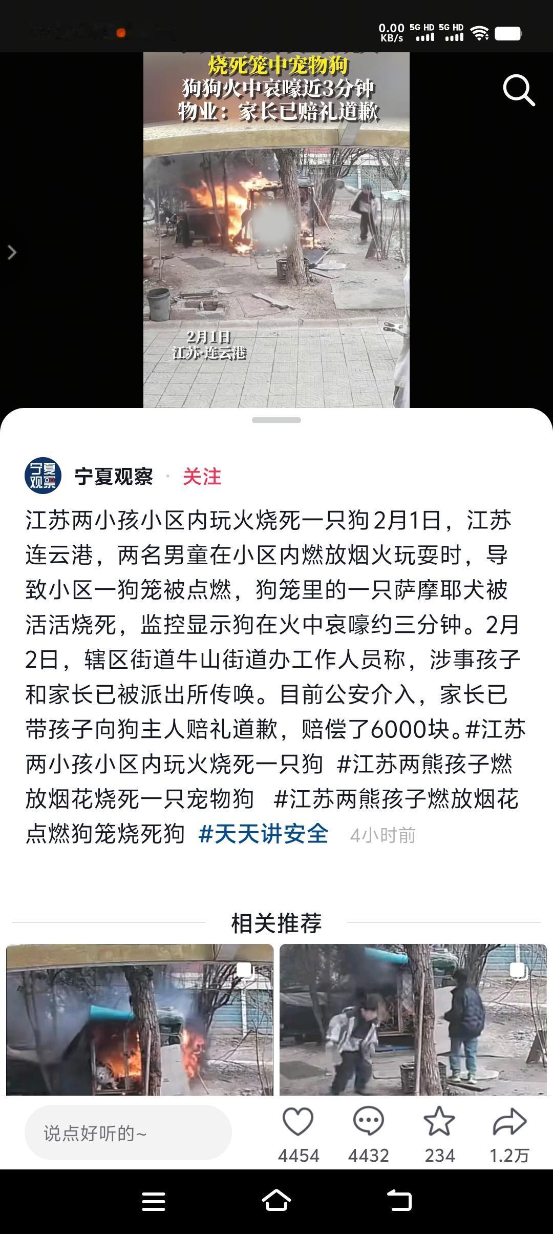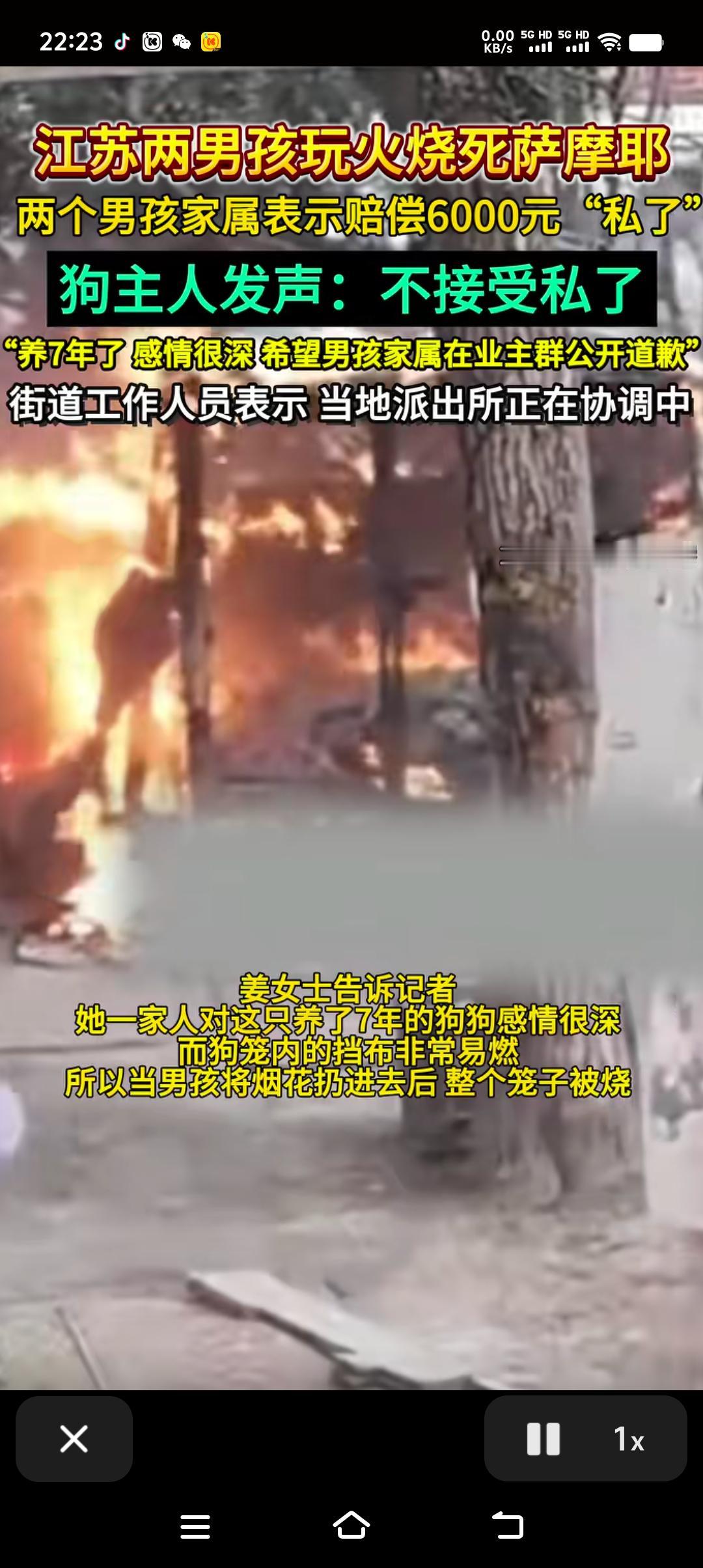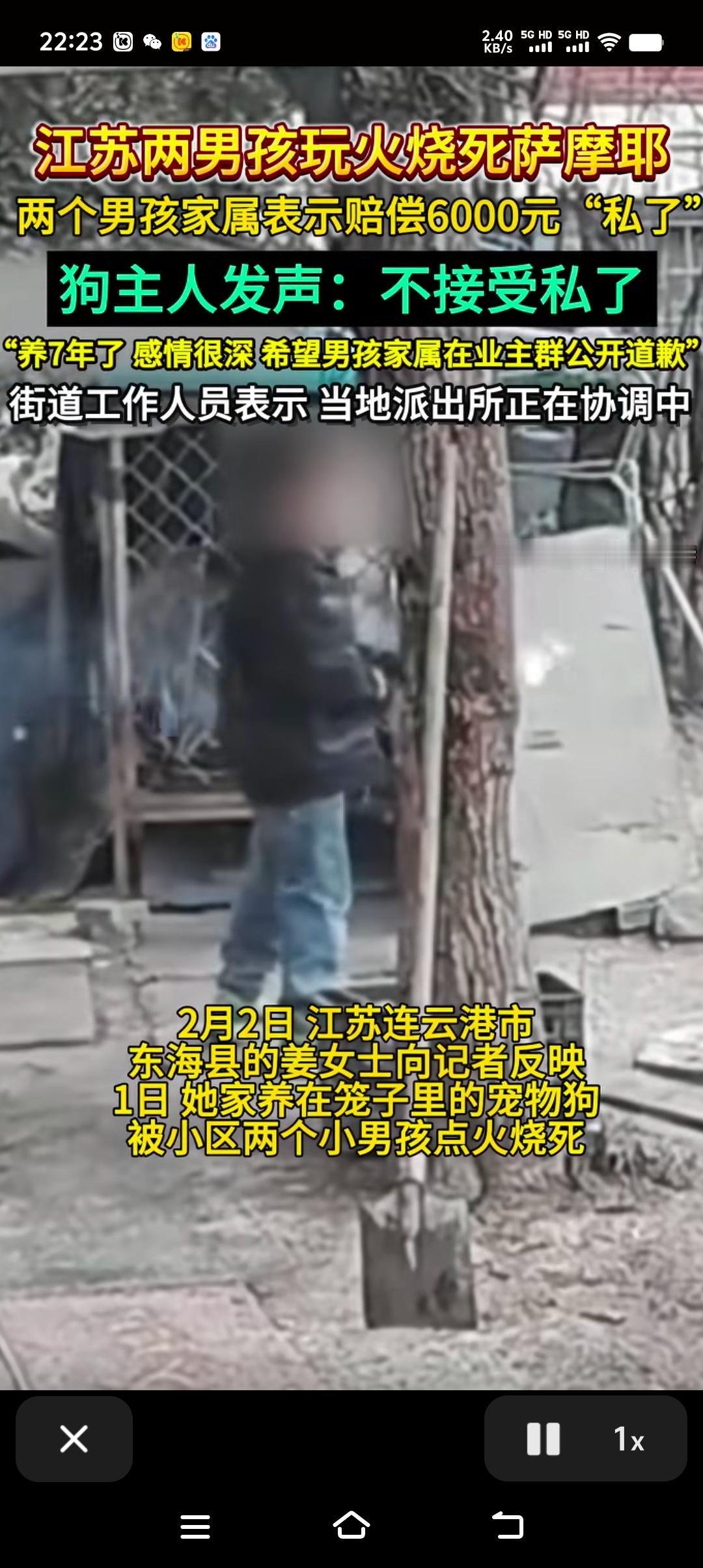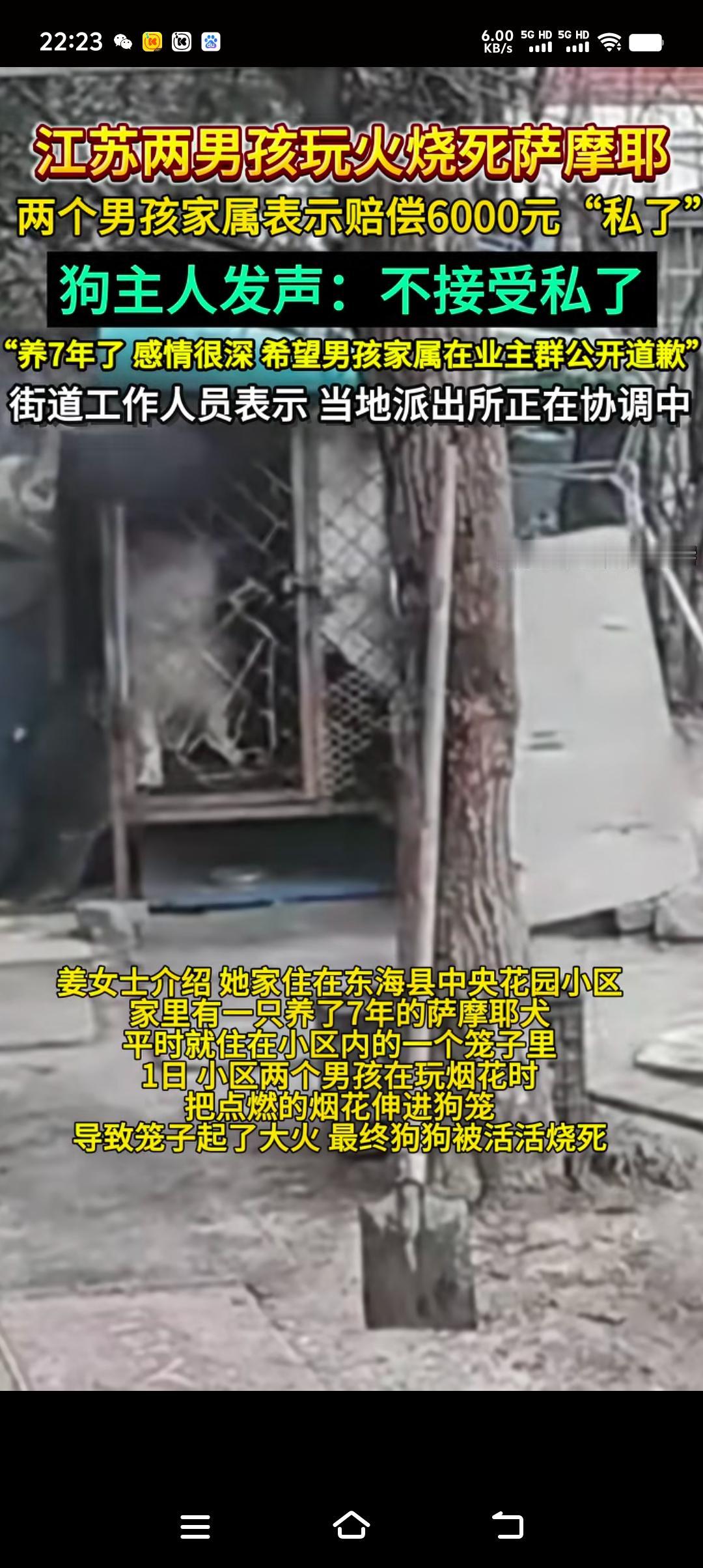 江苏连云港,两男孩手拿点着的烟花追着烧鸡屁股,最后又把燃着的烟花伸入狗笼,一只被关在狗笼里的萨摩耶,在大火中哀嚎3分钟,硬是被活活烧死。两男孩家属表示愿意赔偿6000元私了,或者是另赔一只狗。狗主人不接受私了,希望男孩家属在业主群里公开道歉。 这个世上有两种坏人,一种是娘胎里就有的,一种是长坏了的。两者都是坏人,但长坏了的人并不可怕,因为他本质不好,就怕那种天生坏的人,因为他秉性难移。