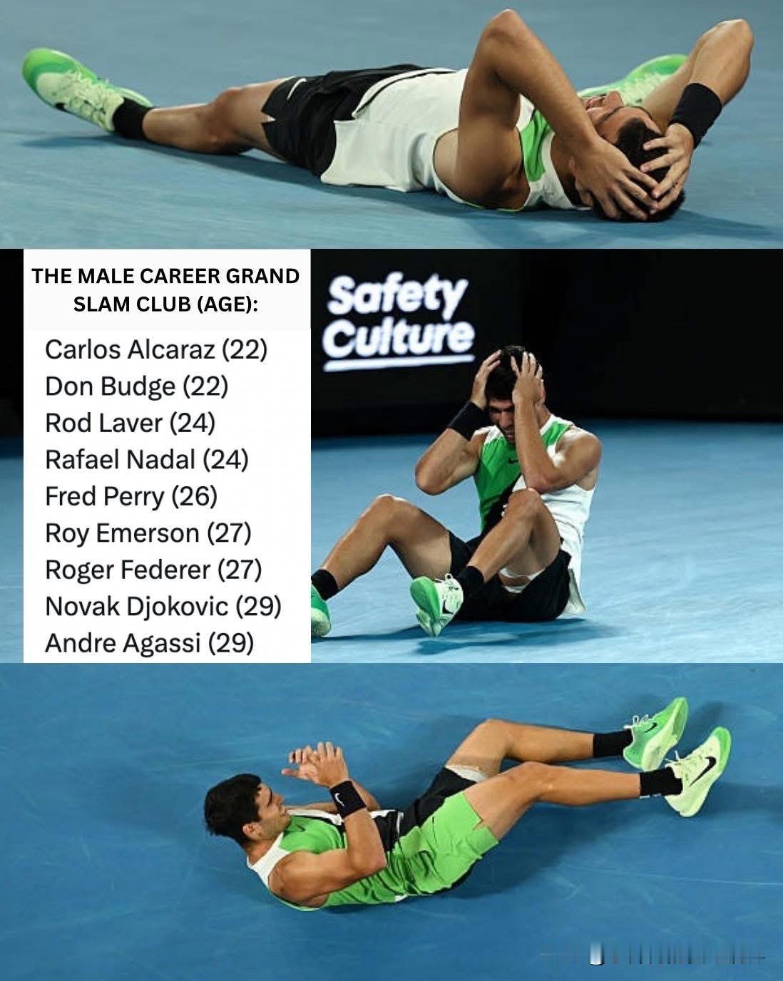 男子网坛职业生涯大满贯俱乐部: 卡洛斯·阿尔卡拉斯(22岁) 唐·巴奇(22岁) 罗德·拉沃尔(24岁) 拉斐尔·纳达尔(24岁) 弗雷德·佩里(26岁) 罗伊·埃默森(27岁) 罗杰·费德勒(27岁) 诺瓦克·德约科维奇(29岁) 安德烈·阿加西(29岁) 西班牙球星 阿尔卡拉斯在澳大利亚网球公开赛男单决赛中,力克十冠王德约科维奇,以22岁之龄成为史上最年轻的实现生涯全满贯(赢得全部四项大满贯)的男子球员,超越其同胞前辈、红土之王纳达尔所保持的纪录。 2026澳网