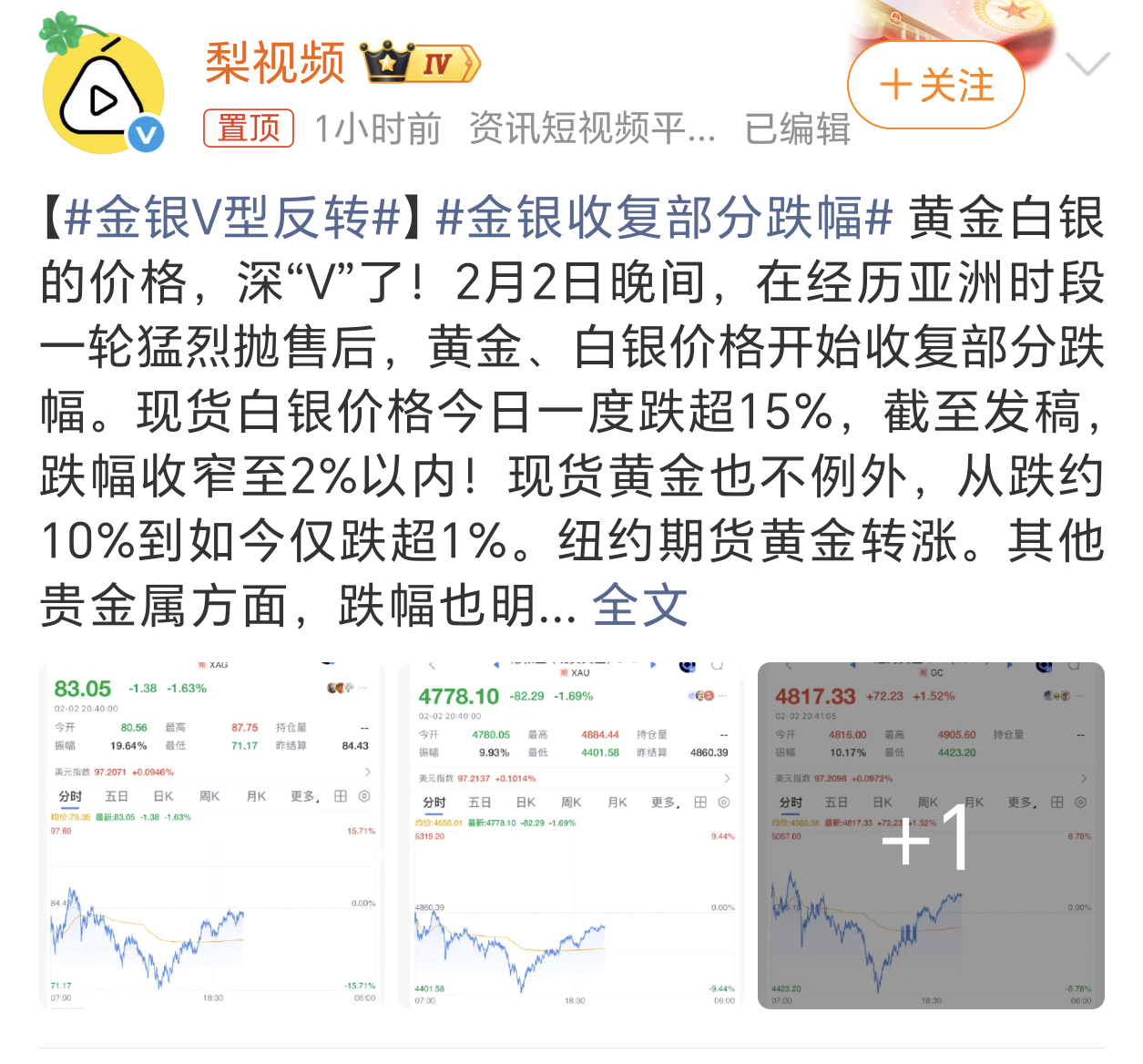 金银V型反转看这意思,明天黄金白银的价格要涨回来了嘛。我手里有只白银的股票,已经