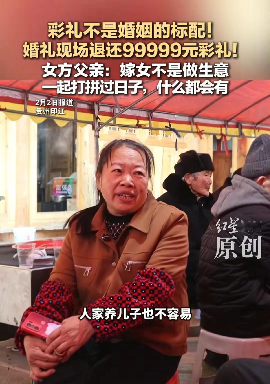 暖哭了!贵州铜仁,男子大婚前,婚前女方家从未提过彩礼要求,婚礼当天他主动送上99999元彩礼,不料,岳父母当场全额退还,还称没能力帮衬小两口,至少不能给孩子添压力。不仅如此,二老还为女儿准备了6万元嫁妆,全力支持小两口新生活。网友纷纷点赞。 1月29日,一场乡村婚礼,在网上火了! 新郎李某和新娘陈某的大婚现场,没有因为彩礼闹矛盾,反而因为岳父母的一番操作,让所有人都觉得心里暖暖的。 李某主动给的99999元彩礼,被岳父母当场全退,还说称没能力帮衬,至少不添压力。 不光如此,二老还特意给女儿准备了6万元嫁妆,全力支持小两口过日子。 李某和陈某是老家的初中同学,多年后重逢走到一起,感情一直特别好。 到了谈婚论嫁的地步,最让李某感动的是,从始至终,岳父母都没提过一句彩礼的事,就只是反复跟女儿说,“俩人好好过日子,能一起打拼,比啥都强”。 陈某之前也问过父亲,要不要跟男方提彩礼,父亲的回答特别实在:“彩礼要不要都行,就算男方给了,我也一分不会留。” 可在李某看来,彩礼是自己的一份心意,也是对岳父母养育女儿的尊重。 他悄悄准备了99999元彩礼,图个“长长久久”的好彩头,还按当地的风俗准备了1元“裱礼”,就想在婚礼上,好好给岳父母和妻子一个交代。 婚礼当天,家里宾客满座,在所有人的见证下,李某双手把装着彩礼的礼盒递给岳父母。 没想到,岳父接过礼盒,转身就直接塞回了他手里,这一下,现场瞬间安静了,紧接着就响起了阵阵掌声。 岳父当着所有人的面说:“我们就是普通农民,没什么大本事,这辈子没给孩子攒下多少家底,没能力帮衬小两口,但至少不能给他们添压力。” 他还说,自己年轻的时候结婚,啥都没有,当时岳父母也没嫌弃,这份情他记了一辈子,现在女儿出嫁,他也只想让孩子们轻装上阵,好好过日子。 一旁的岳母也笑着补充:“养女儿不容易,养儿子也不容易,都是农村人,互相体谅就好,就盼着他俩以后相亲相爱,把小日子过红火。” 更让小两口感动的是,岳父母不光退了彩礼,还早早地省吃俭用,给女儿攒了6万元嫁妆,里面还包含当地“压箱底”的风俗礼金,全是二老的辛苦钱,就想给小两口的新生活,添一笔启动资金。 陈某说,其实她早有预料,因为2023年姐姐出嫁的时候,爸妈也是这样,没收彩礼还陪了嫁妆,就连哥哥结婚,嫂子家退的彩礼,爸妈也一分没要,全留给了哥哥嫂子。 这场暖心的婚礼,被亲友拍下来发到网上后,一下子就火了,网友们纷纷给这对通情达理的岳父母点赞,评论区全是感动的声音。 有网友说:“这才是真正为孩子着想的父母,不图钱,只盼孩子幸福,这样的家庭教出来的孩子,人品肯定差不了!” 还有网友感慨:“见多了因为彩礼谈崩、闹掰的情侣,这场婚礼真的太治愈了!彩礼本来就是一份心意,不是攀比的筹码,这老丈人简直是女婿心中的理想岳父!” 也有网友说:“看着是退了彩礼,其实是给了小两口满满的信任,相信这小两口以后肯定会好好孝顺父母,这份双向的温暖太珍贵了!” 李某说,岳父母的做法让他特别感动,也让他更坚定了好好对待妻子、孝顺双方父母的决心:“爸妈这么疼我们,我以后肯定和陈某好好打拼,把小日子过好,绝对不辜负二老的期望。” 《民法典》第1042条:明确禁止借婚姻索取财物。彩礼应是自愿赠与,不能强行索要。 女方家自始至终未提彩礼,男方主动给付,符合该条款精神 。 其实这场婚礼,也让大家看清了婚姻的根本,从来都是两个人的爱和陪伴,彩礼从来都不该是幸福的绊脚石。 岳父母这份不图回报的爱,不光温暖了李某和陈某这对新人,也让更多人看到,结婚最美好的样子,就该是这样简简单单、满心都是为对方着想。