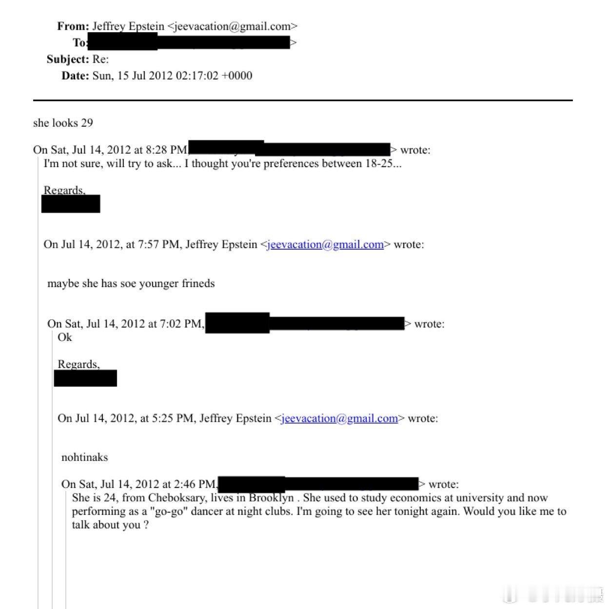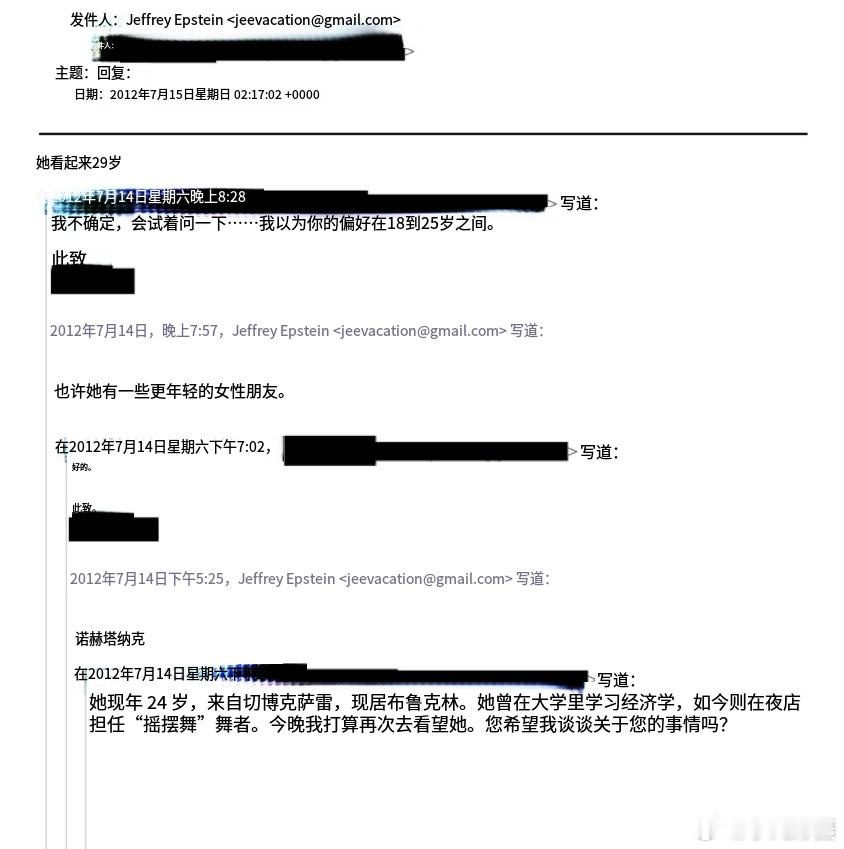 “也许她有一些更年轻的朋友”——爱泼斯坦 因年龄问题拒绝了一位24岁的俄罗斯模特。据Mash报道,这位“来自切博克萨雷,现居布鲁克林”的模特甚至在《疾速追杀3》中客串出演。对爱泼斯坦来说,她已经太老了。海外新鲜事黄媒不会说的真相