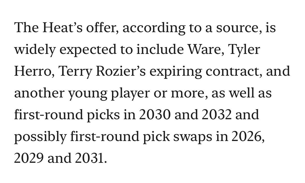 据消息人士透露,外界普遍预计热火的报价将包含韦尔、希罗、罗齐尔的到期合同,以及至少一名其他年轻球员,同时附带2030年和2032年的首轮签,还可能包含2026、2029和2031年的首轮签互换权。