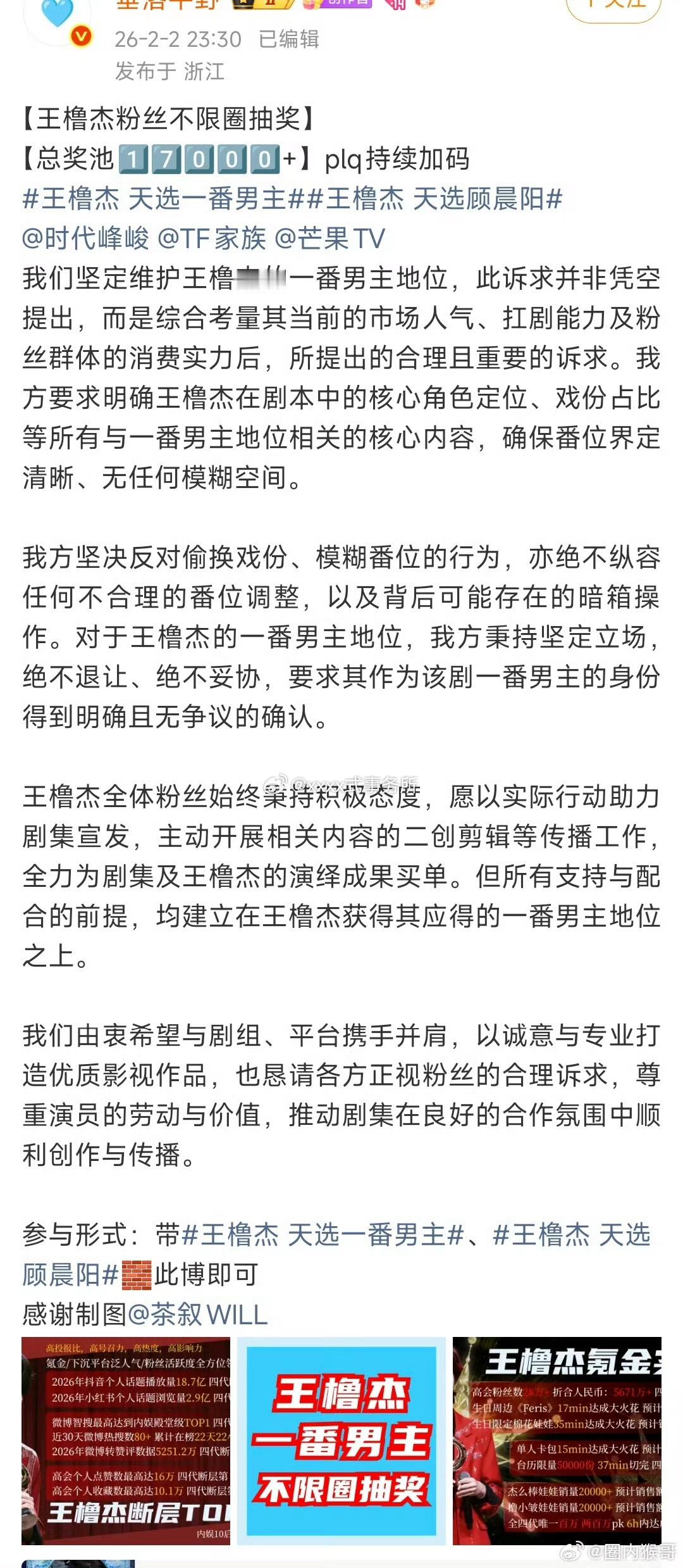 王橹杰粉丝发起了不限圈抽奖要求保证王橹杰的一番男主待遇和地位