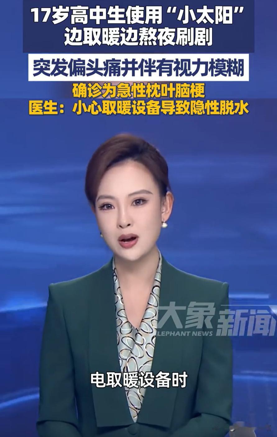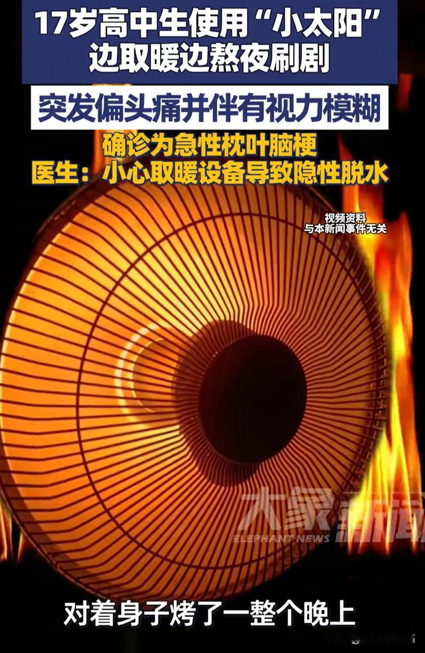 这是真没想到!福建,一名17岁高中生放假在家,因为天气冷了就找出小太阳取暖,凌晨用手机刷剧时,突然头晕眼花,而且头疼不已,被家人送到医院后,竟被诊断为急性枕叶脑梗。网友:好像盯久了确实头疼。 急诊室里那种白得发冷的观片灯一亮,家属的心就先沉了一截,医生把CT片举到灯下,指着后脑位置一块异常影像,说的是“急性枕叶脑梗”。 很多人听到“脑梗”会下意识想到老人,可这张病历单上,写的却是一个17岁的高中生,家属当场发懵,第一反应就是“怎么可能”“是不是看错了”。 发病前几个小时,他还在家里床上,寒假备考,睡不着也正常,他就躺在被窝里刷手机,房间里不算冷,他又开了“小太阳”取暖器,想让自己更舒服一点。 为了暖得快,他把取暖器拉得很近,甚至对着被子边缘吹烤,被子又厚,身体一热就出汗,但人一直躺着不动,也没起身喝水,屋里也比较干,空气和热源一起把水分往外带。 这种场景对很多人来说很熟:冬天取暖、窝在被子里、手机一刷就到深夜,可问题在于,长时间近距离烘烤,会让皮肤表面水分蒸发得更快,人在不知不觉中变得缺水。 被窝里又闷,出汗后水分流失更多,但又不会像运动那样主动补水,再加上他熬夜、精神兴奋,身体一直处于“紧绷”的状态,这些因素叠在一起,会让血液黏稠度上升、循环变慢,风险就会被推高。 他开始的时候可能是头皮有点发麻、眼睛干涩、看手机久了发酸,很多年轻人会把这些当成“熬夜正常反应”,揉揉眼、换个姿势继续刷,不太会想到是身体在发信号。 尤其是备考阶段,很多人习惯忍着:困了忍、累了忍、头痛也忍,觉得睡一觉就好。 真正出事是在凌晨三点多,他想翻个身,发现右半边身体不太听使唤,像突然没力气,手脚沉得抬不起来。 紧接着头痛加重,不是那种“睡少了”的钝痛,而是很难受的剧烈疼,更让他害怕的是视力变化:眼前开始发花、发暗,视野里像缺了一块,手机屏幕的字看不清,光线也变得怪。 他意识到不对劲,用左手勉强操作手机,给父母发消息求助,信息发出去后,他整个人就瘫在床上,动不了也说不清。 父母听到动静冲进房间时,孩子脸色很差,出汗、发冷交替,右侧肢体明显无力,讲话也可能不利索。 家里人在这一刻才真正慌了:不是“他又熬夜了”,而是“出大事了”,送去急诊后,医生按流程快速查体、做影像,最终在CT上看到了枕叶区域的急性梗死表现。 枕叶主要和视觉有关,所以这类脑梗往往会出现视野缺损、视物模糊、看东西“少一块”等问题。 对一个17岁的孩子来说,这种打击不仅是当下的危险,更会影响后续学习和生活,即便抢救及时,后面也常常要面对一段较长的康复期:肢体力量训练、精细动作训练、视功能评估与恢复、生活能力重新建立。 很多人以为脑梗就是“躺几天就好”,但真正恢复起来,很考验家庭的耐心和经济能力,也考验孩子自己的心理承受力。 这件事让人后背发凉的原因在于,它不是“完全不可想象”,近些年医院里,年轻脑卒中的病例确实在变多,诱因也越来越生活化。 熬夜、久坐、缺水、饮食油腻、肥胖、长期压力大,有的还有基础疾病但自己不知道(比如血脂高、血压波动、血液高凝状态、心脏问题等)。 很多年轻人不抽烟不喝酒,就觉得自己安全,其实生活方式本身,就可能把风险一点点堆起来。 这起福建少年的情况,被很多人总结成“取暖器+熬夜+不喝水+长时间不动”的叠加,取暖器不是“凶手”,熬夜也不是“一次就出事”,但在特定条件下,它们可能成为触发点。 最可惜的是,身体给过提醒——头皮麻、眼干、视疲劳、状态异常——如果当时停下来喝水、起身走动、早点睡,或者症状一加重就立刻叫人,后果可能会不一样。 最实用的提醒其实很朴素:冬天用“小太阳”、电暖器这类近距离辐射热源时,别对着人体长时间烤,尤其不要在被窝里烘很久;熬夜时一定要补水、适当起身活动。 一旦出现突然的单侧肢体无力、说话含糊、口角歪斜、视力突然变差、剧烈头痛等情况,别硬扛,立刻就医,对年轻人来说,这些不是“矫情”,而是把风险降到最低的办法。 信源:《1月29日(报道)福建,17岁高中生使用“小太阳”,边取暖边熬夜刷剧,突发偏头痛并伴有视力模糊,确诊为急性枕叶脑梗,医生:小心取暖设备导致隐性脱水》大象新闻