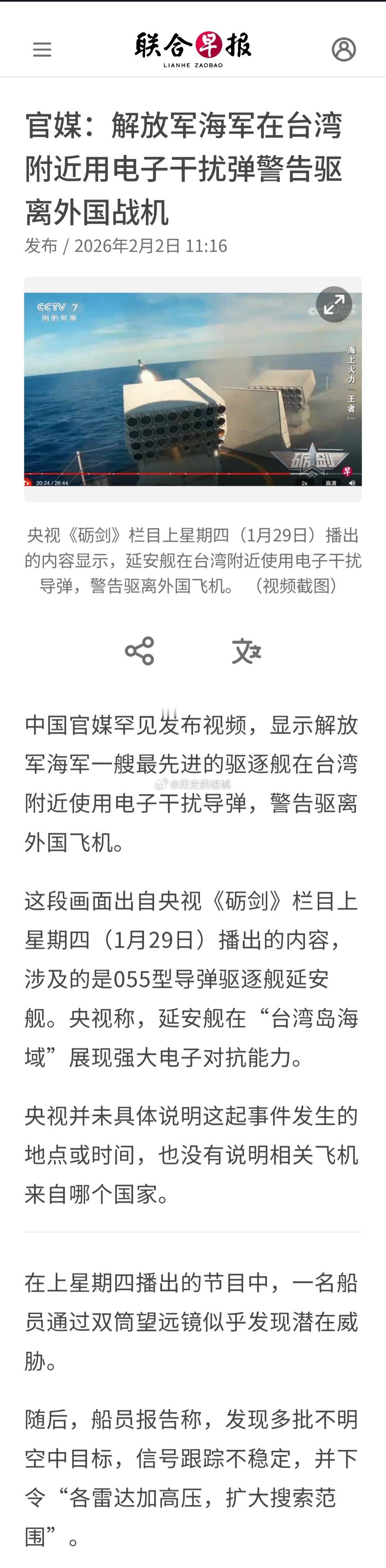 中国官媒罕见发布视频,显示解放军海军一艘最先进的驱逐舰在台湾附近使用电子干扰导弹,警告驱离外国飞机。这段画面出自央视《砺剑》栏目上星期四(1月29日)播出的内容,涉及的是055型导弹驱逐舰延安舰。央视称,延安舰在“台湾岛海域”展现强大电子对抗能力。央视并未具体说明这起事件发生的地点或时间,也没有说明相关飞机来自哪个国家。