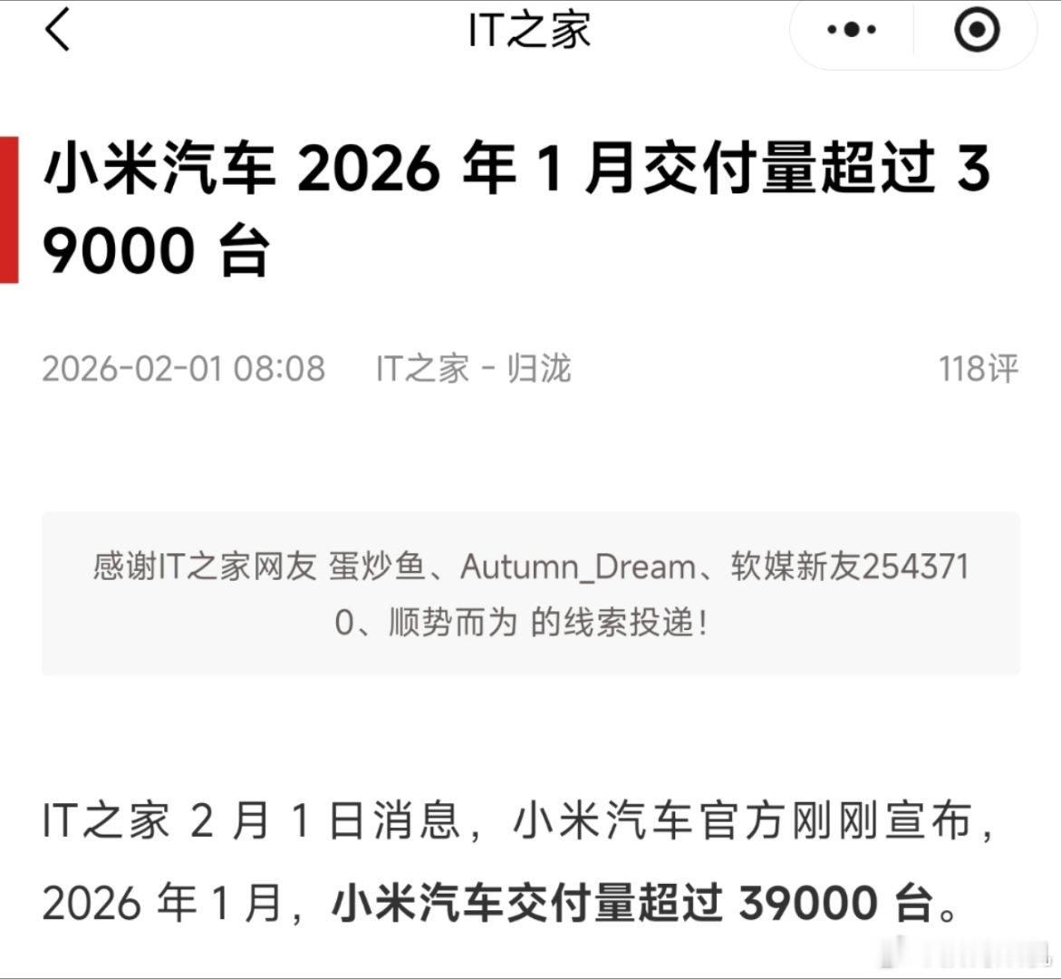 新的一年有购置税的影响,一般同比环比下滑都是很正常的。看到小米汽车这里,我还以为