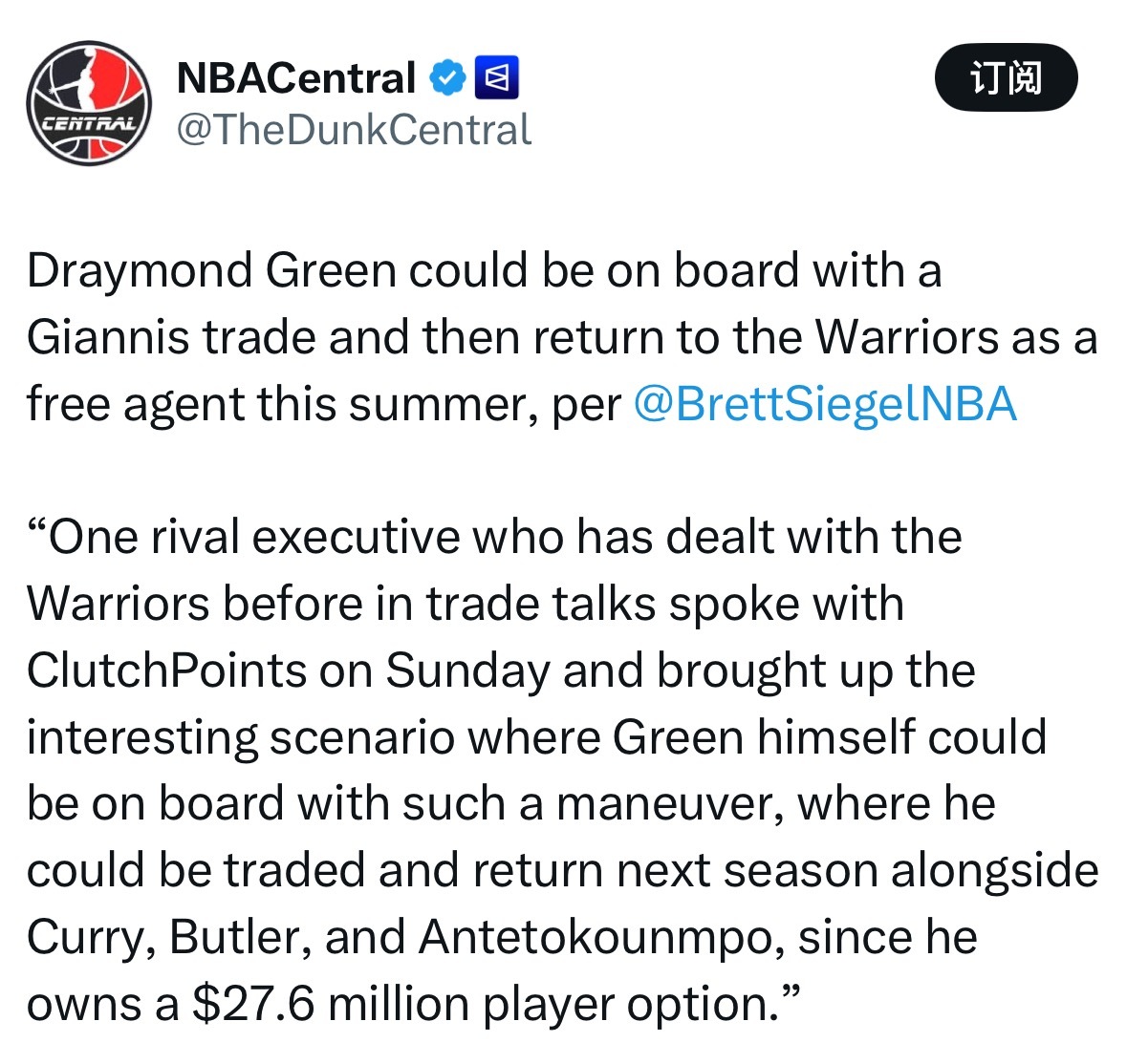 NBA记者Brett Siegel:格林或同意被纳入字母哥交易,今夏再以自由球员身份重返勇士。