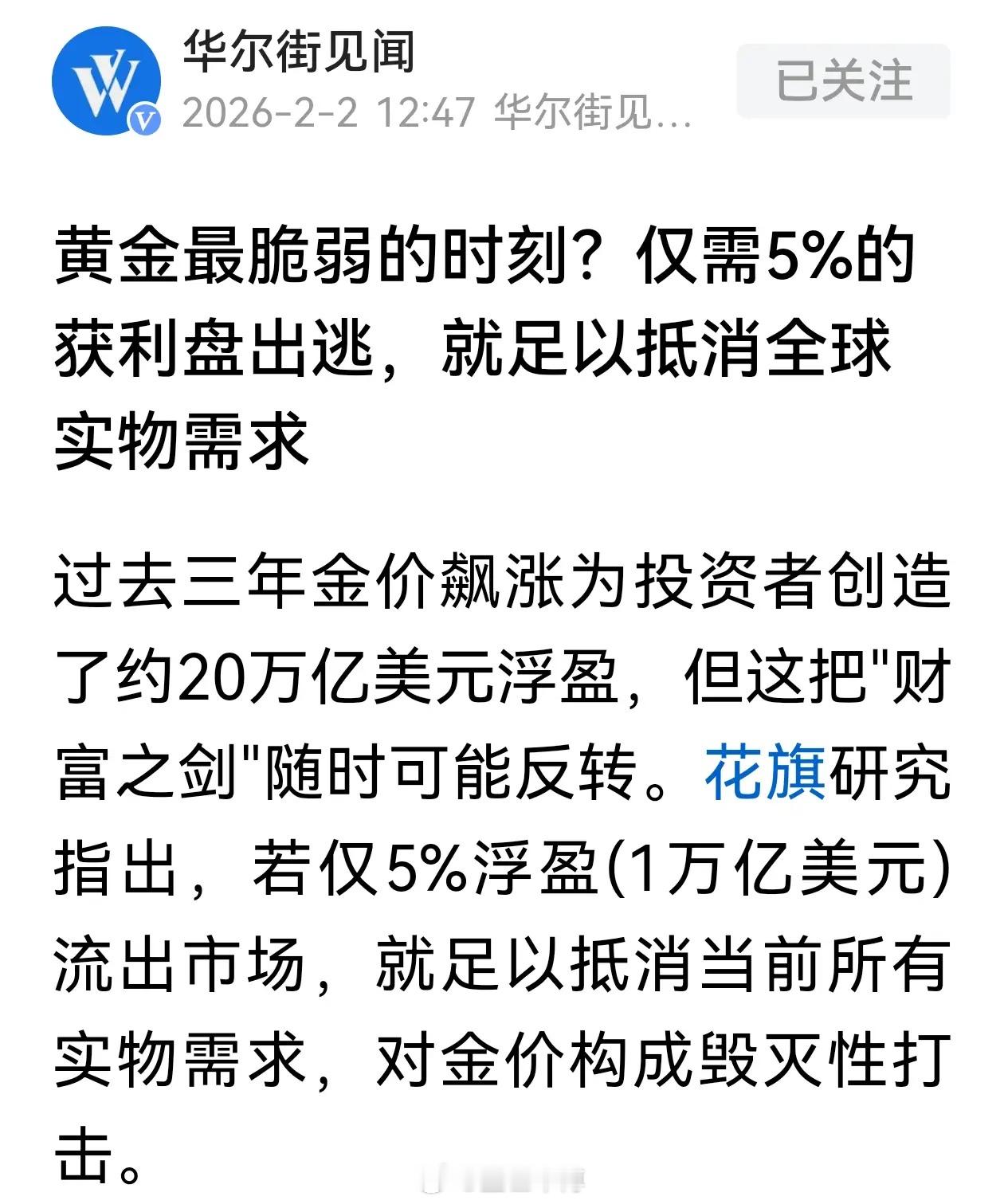 花旗研究团队的报告,提供了关于黄金的几组数据:本轮行情的涨幅:从2500美元/盎司上涨到5100美元/盎司;推动行情上涨的资本流入1万亿美元,黄金持有者累积账面利润20万亿美元;目前全球对黄金的年度支出占GDP比重为0.7%,是过去55年最高水平,超过石油危机的1980年,黄金配置占GDP比例常态下在0.3%—0.4%;黄金与全球广义货币供应量的比率目前已升至16%,高于1970年代第一次石油危机的高点;央行对黄金的需求规模过去三年大致不变,在1000亿—1500亿之间,市场化投资者的资本配置一万亿美元,驱动因素主要是剔除央行后的投资者需求。目前的金价已完全脱离了采矿业的边际成本,研报显示高成本金矿商的利润率正处在50年来最高水品。黄金价格是对未来不确定性和风险的定价,受地缘政治分险、美元走势、市场情绪等影响,但没有什么成熟的估值模型,谁也不要说能预测黄金的价格。黄金价格高不高,看到花旗的这些数据就明白了,既然脱离常态太远,那一定是高了,回归也就是不意外了。