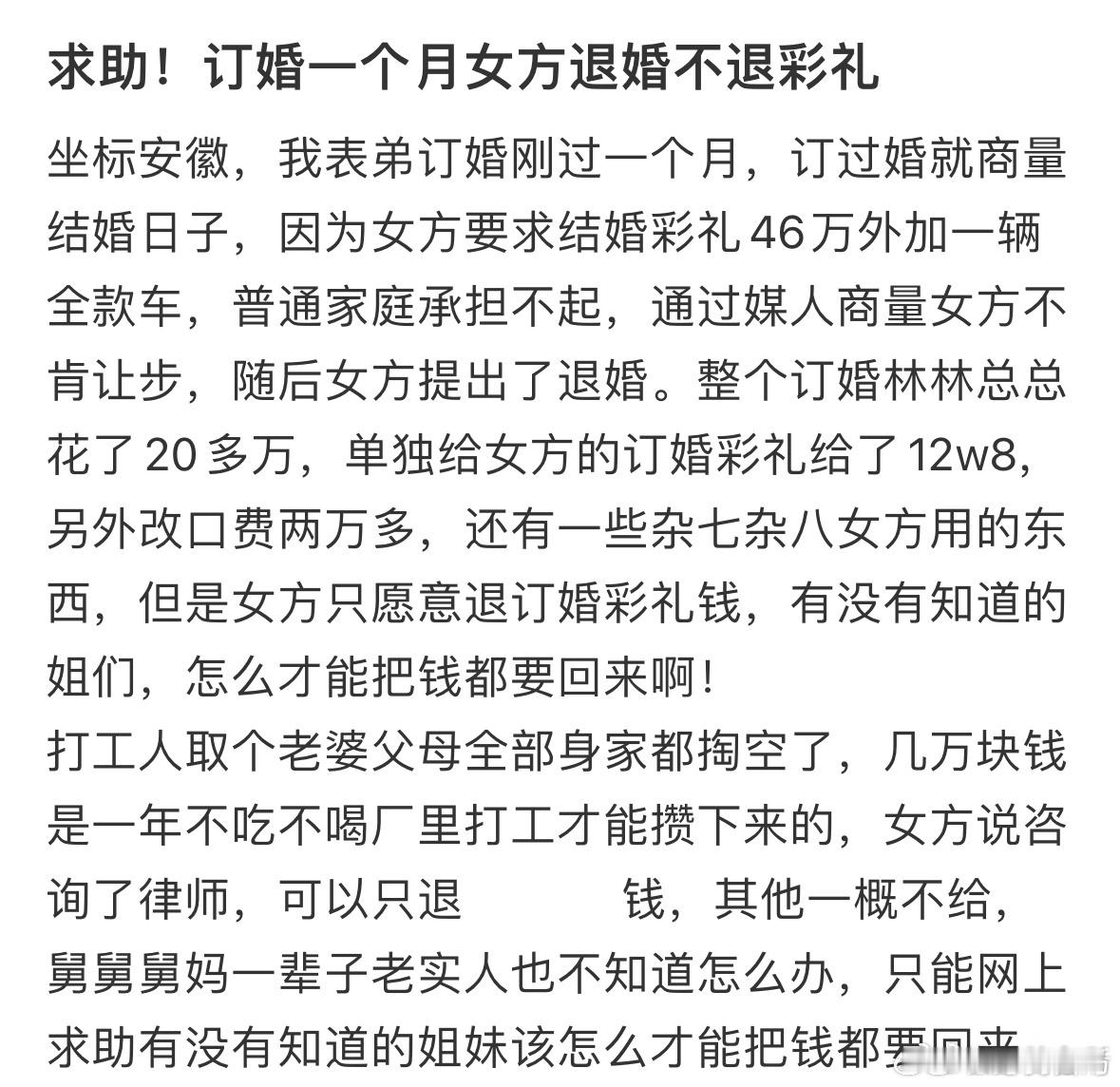 求助!订婚一个月女方退婚不退彩礼怎么办❓