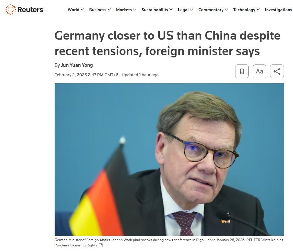 德国外长瓦德富尔昨天(2月2日)在访问新加坡期间表示,尽管存在紧张关系,德国仍坚定站在美国一边,德国与美国、中国的关系并非“等距”,华盛顿仍是欧洲、德国最重要的伙伴。瓦德富尔同时警告,不应因与美国的分歧而在战略上转向北京。 [机智]评几句:毕竟“狗链子”攥在美国手里,德国外长瓦德富尔讲这话也正常。德国确实没资格谈外交等距,德国作为美国陆军海外驻军最多的单一国家,数万美军驻军与上百处军事基地早已将“狗链子”攥在美方手中,军事安全的绝对依附让德国只能沦为美国地缘博弈的附庸。即便美欧间有军费、关税等诸多分歧,即便中国是德国重要经贸伙伴,瓦德富尔仍要刻意喊话拒绝“转向北京”,这般姿态看似选边站队,实则是被美国军事控制下的身不由己。所谓德国的战略自主,在美军的铁蹄下不过是一句空谈。