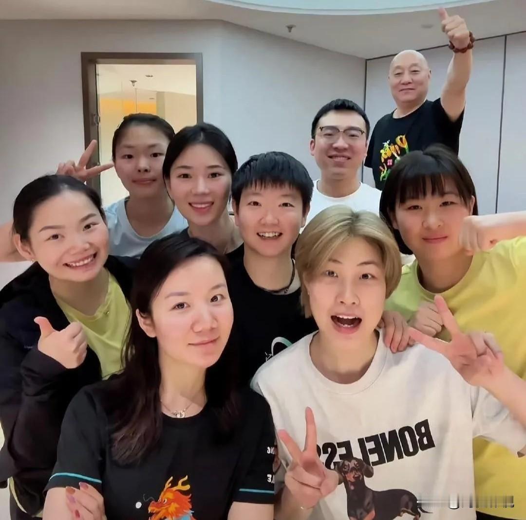 合影人数再多,相信你一眼就认出莎莎。莎莎的魅力你不服不行。 我老眼昏花,从后往前连估加猜就认得出:杨广弟、姚睿轩、王添艺、何卓佳、孙颖莎、朱梓予,而前排右边那个黄头发是谁?看她细眉飞扬,秀韵多姿!能与国乒队员们合影真是不简单!她也是国乒女队员吗?有谁认识她?