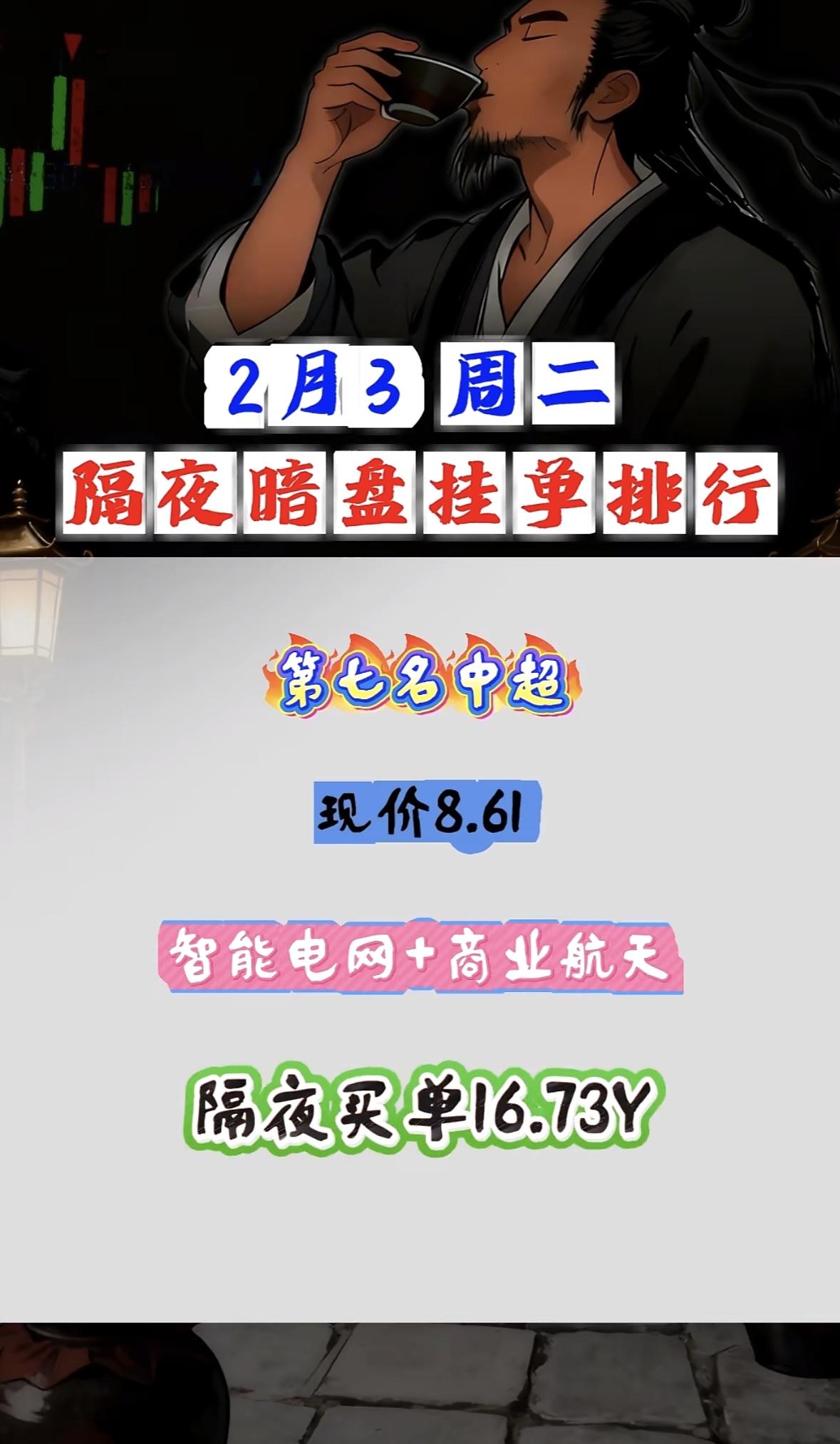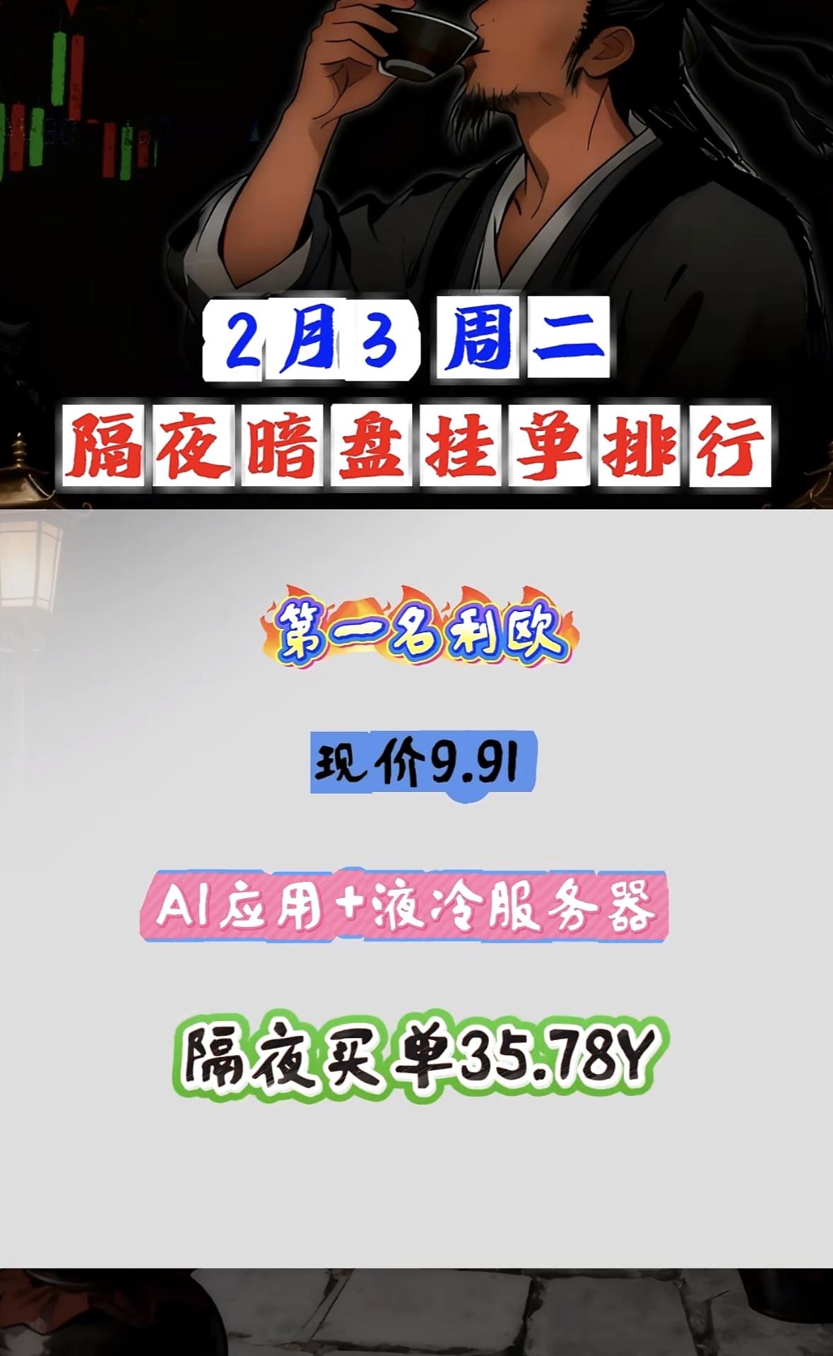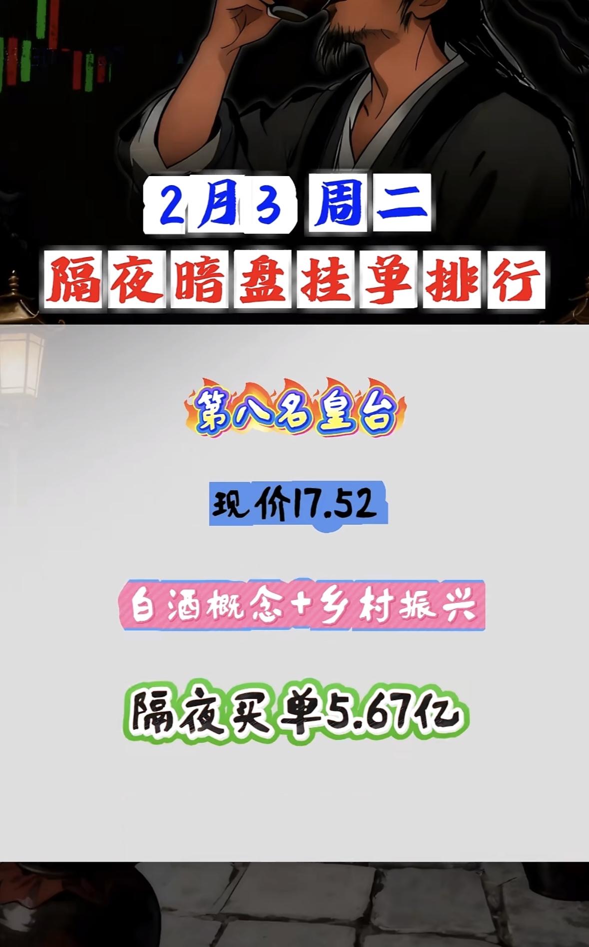 2月3日隔夜暗盘挂单,利欧领航。 "皇台白酒乡村振兴概念受捧,隔夜买单近六亿现