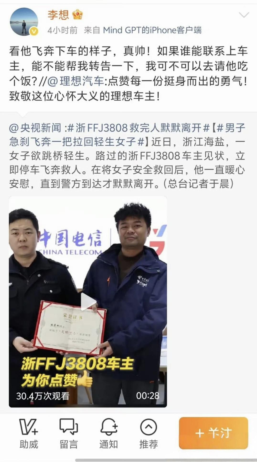 理想车主高速紧急救人 李想十分感动欲请吃饭 理想车主口碑好感度+1 【来自懂车帝车友圈】
