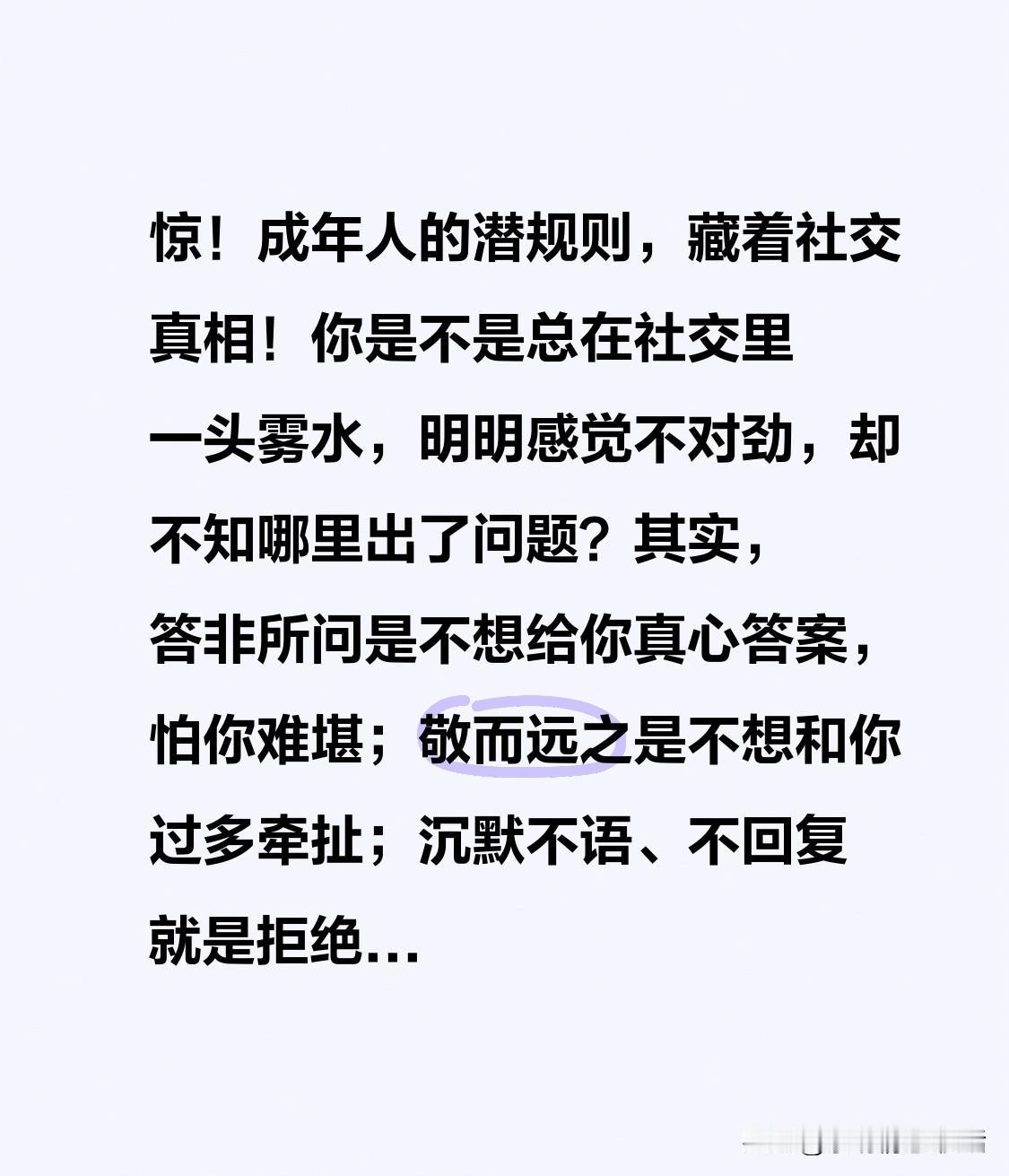 惊!成年人社交藏着这些潜规则! 你是否在社交中常感困惑,觉得不对却不知问题在哪? 其实,答非所问是不想真心回应,怕你尴尬;敬而远之是不想多有牵扯;沉默不回是拒绝;闪烁其词是撒谎;忽冷忽热说明你价值有限。 成年人社交,潜规则即“潜台词”。读懂少吃亏。 你遇过哪种?评论区聊聊,有用就点赞收藏,别做社交“糊涂蛋”!中年社交真相 为人处世潜规则 当代社交真相 圈层社交陷阱