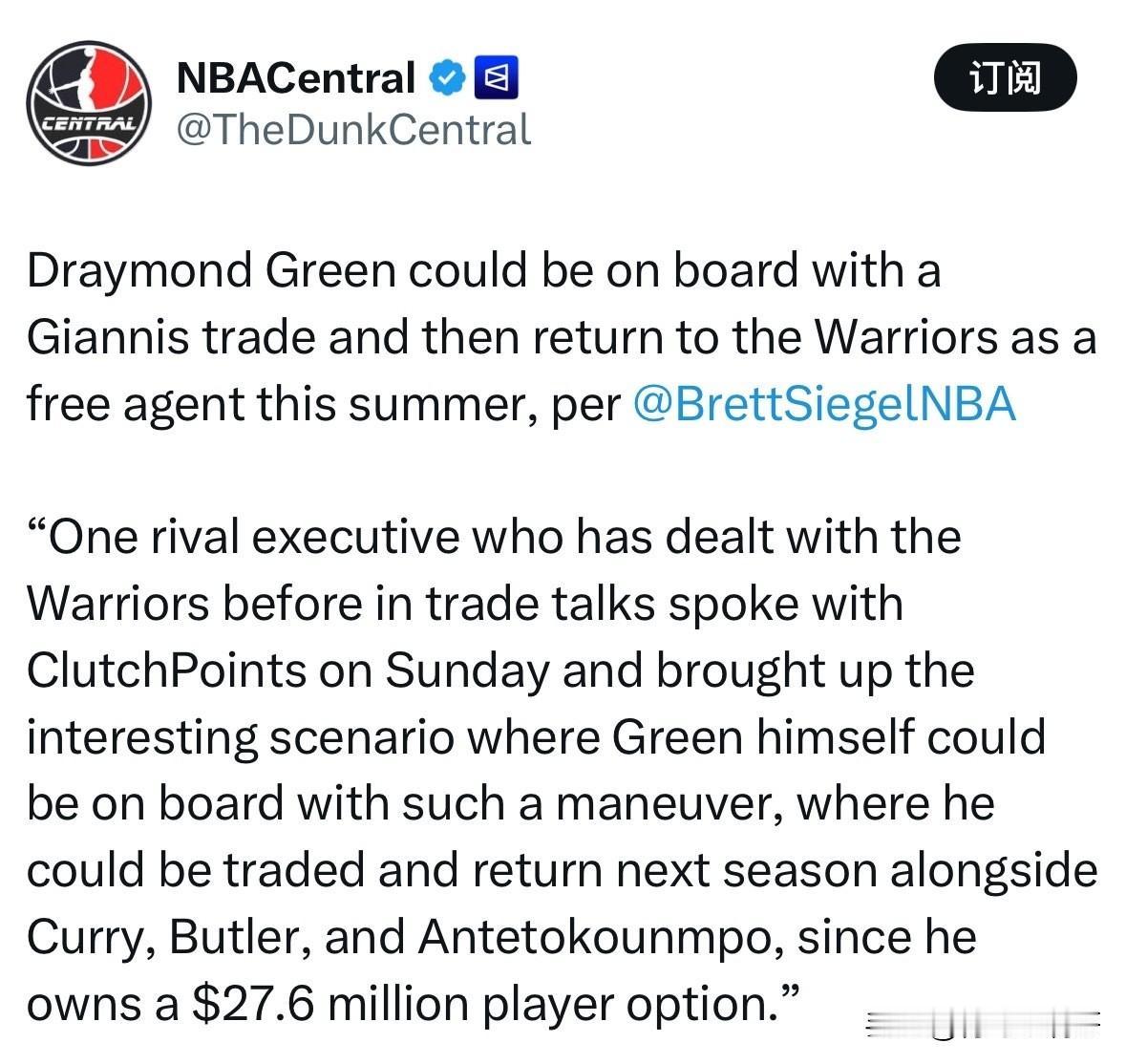 还能这么玩,勇士真把雄鹿当猴耍了! 根据记者Brett Siegel最新消息透露,勇士可能会将追梦-格林纳入字母哥交易方案中,貌似格林也是同意的,但是他的最终目标仍然是在今夏休赛期以自由球员身份重返勇士。 这个就有点过分了吧,能这么玩吗,勇士也太不尊重雄鹿了吧,或者说格林不尊重雄鹿,把雄鹿当猴子耍,真当人家傻了。 而联盟中有和勇士交易过的其他球队管理层表示,这个方案是可行的,追梦也会认可同意,今年夏天他是有球员选项的,如果跳出合同,那么他就有了自主选择权,届时重回勇士就不再是什么问题了,唯一的障碍就是合同金额了。 看来真的是绞尽脑汁啊,这方案一般人想不出来,格林确实适合勇士,但是把字母哥和格林都放外线的情况下对方都不会眨眼,就让你投,全场让你在那看你能投进去几个,到时候就成为新的问题了。金州勇士 勇士队 追梦格林 字母哥