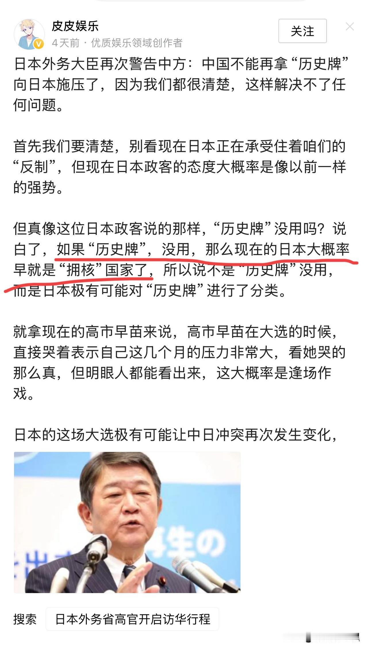 日本外务大臣警告中国:不能再拿“历史牌”向日本施压了,因为我们都清楚,这样解决不了任何问题。 我们在对日本进行历史上最严厉的反制,但日本却越来越强硬,似乎并不担心中国的制裁。 我们的“历史牌”打了半个多世纪,以至于有的人盲目的以为,是我们的这张牌让日本一直不敢拥有核武器,这种迷之自信日本早已看透,只有我们自己相信,别忘了,那是联合国宪章对战败国的限制,如果“历史牌”管用,那就不会发生侵略了,日本如果会牢记历史教训,根本就不会如此嚣张。 中国老百姓很清醒,而有的貌似很清醒的专家,不知道是愚昧还是有意为之,就不得而知了。 ——————————